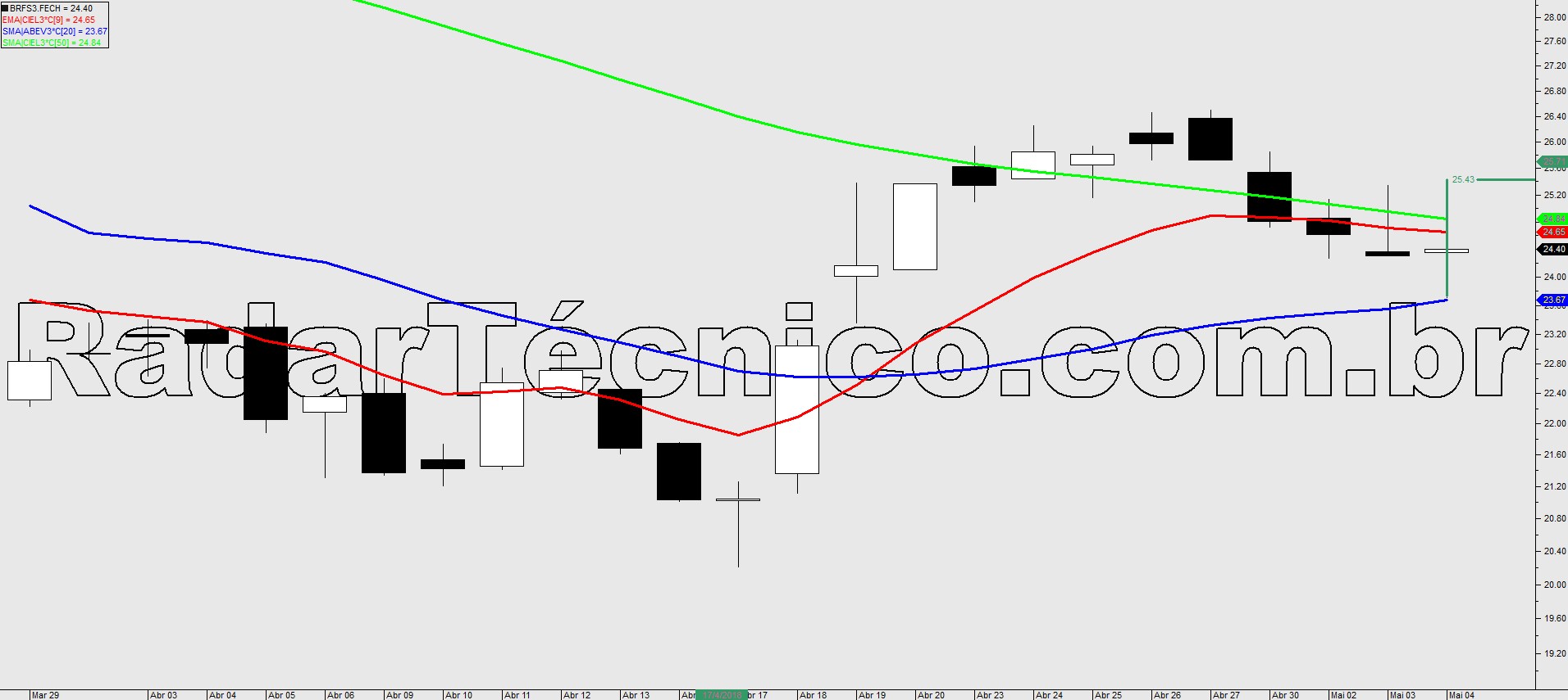 O ativo BRFS3, no prazo diário, possibilita um provável trade, na superação de R$ 24,56 com alvo inicial em R$ 25,43 e stop posicionado em R$ 23,67.