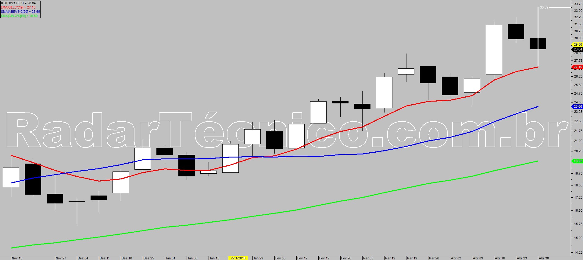 O ativo BTOW3, com médias móveis de 9, 20 e 50 períodos ordenadas e ascendentes, autoriza um possível trade, na superação de R$ 30,28 com alvo inicial em R$ 33,39 e stop posicionado em R$ 27,07.