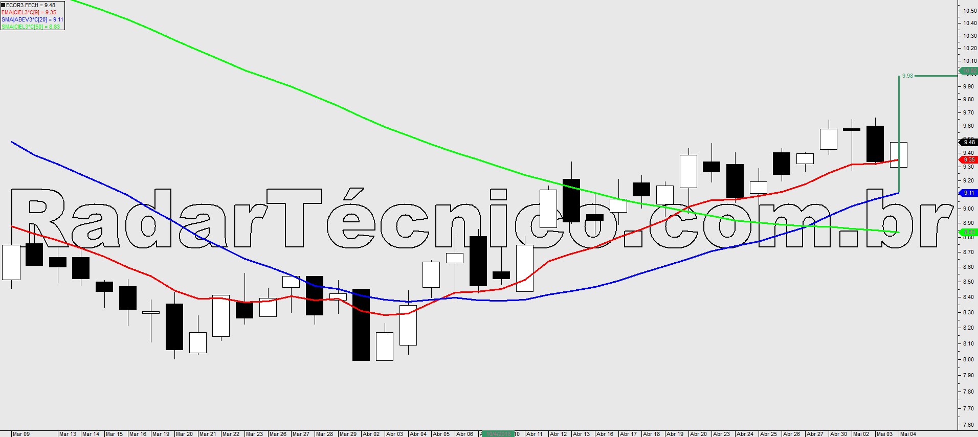 O papel ECOR3, no prazo diário, com médias móveis de 9 e 20 períodos ordenadas e ascendentes, autoriza um possível trade, pelo setup de ponto contínuo, na superação de R$ 9,55 com alvo inicial em R$ 9,98 e stop posicionado em R$ 9,08.
