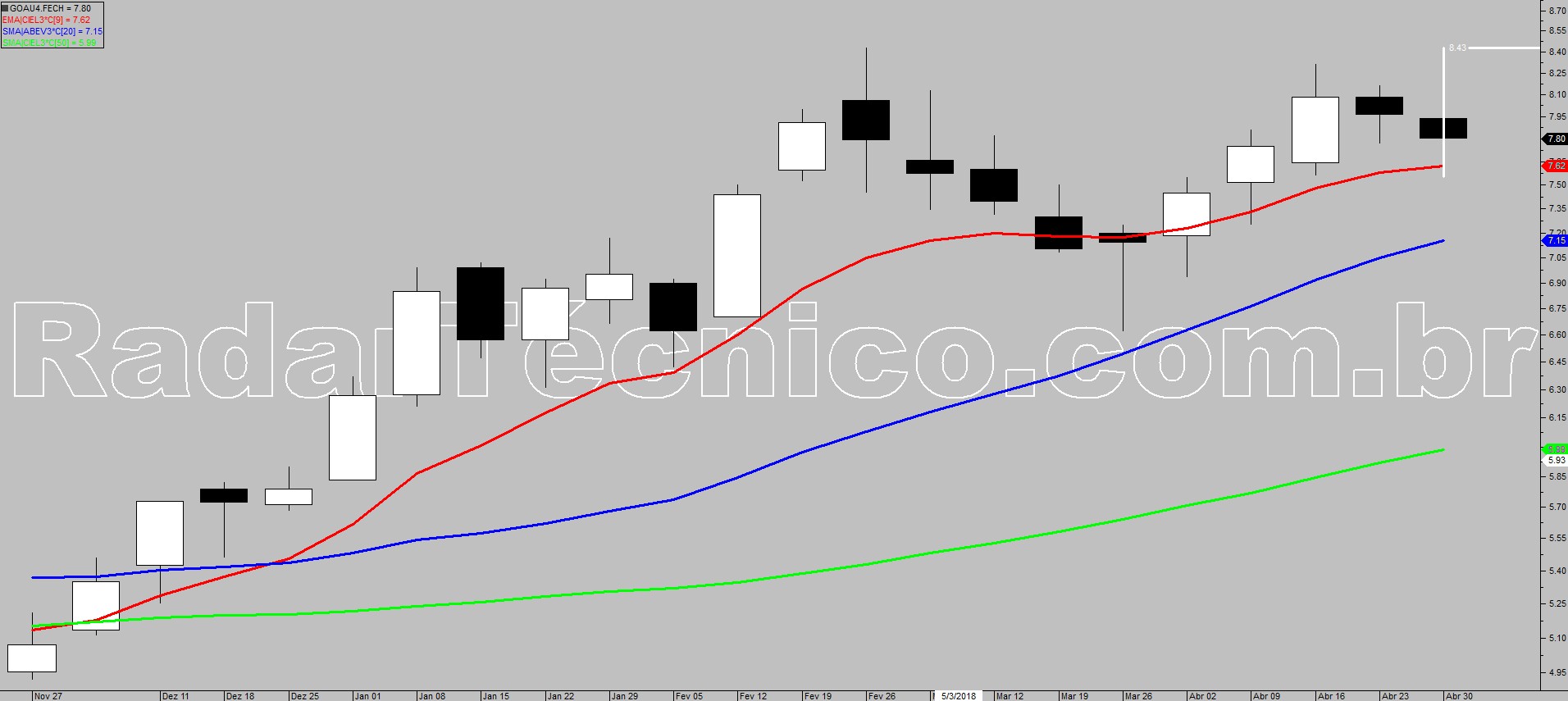 O papel GGBR4, com médias móveis de 9, 20 e 50 períodos ordenadas e ascendentes, autoriza um possível trade, pelo setup de ponto contínuo, na superação de R$ 16,93 com alvo inicial em R$ 17,68 e stop posicionado em R$16,14.