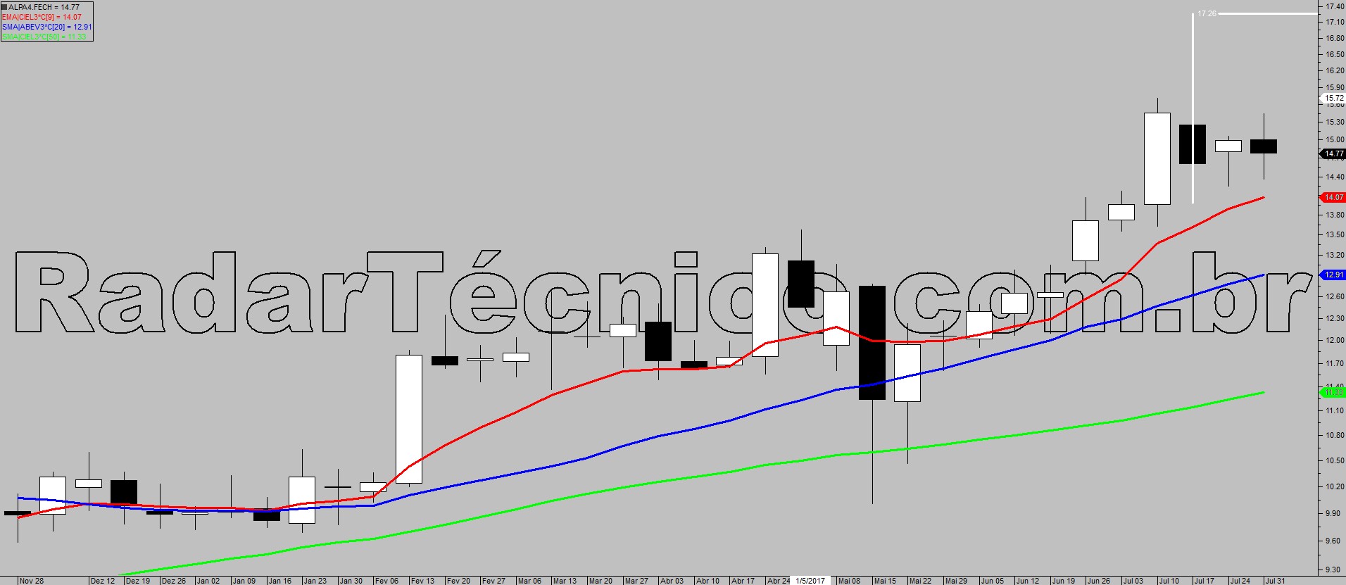 O papel ALPA4 encontra-se com médias móveis de 9, 20 e 50 períodos ordenadas e ascendentes, autorizando um possível trade pelo setup de realização frustrada na superação de R$ 15,62 com alvo inicial em R$ 17,26 e stop posicionado em R$ 13,94.