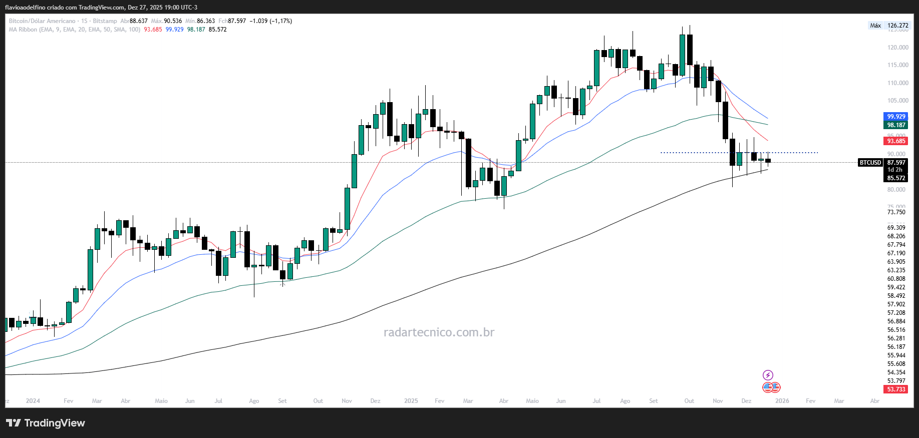 Durante a última sexta-feira, o BTC tentou uma recuperação, mas não conseguiu sustentar os ganhos, impactado pela baixa liquidez típica do período entre o Natal e o fim do ano.