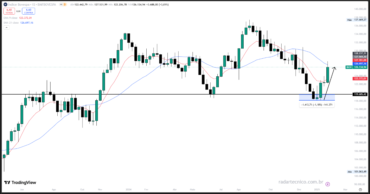 IBOV encerra a semana em alta de +3,01%, com cotação em 126,13 mil pontos. Mercado segue em tendencia de baixa e, após encontrar liquidez em fundo de suporte, demonstrou força compradora ao concluir quarta semana consecutiva de alta. O Índice está demonstrando provável mudança para tendência altista, já sinalizada pela virada para cima da média móvel de nove periodos.