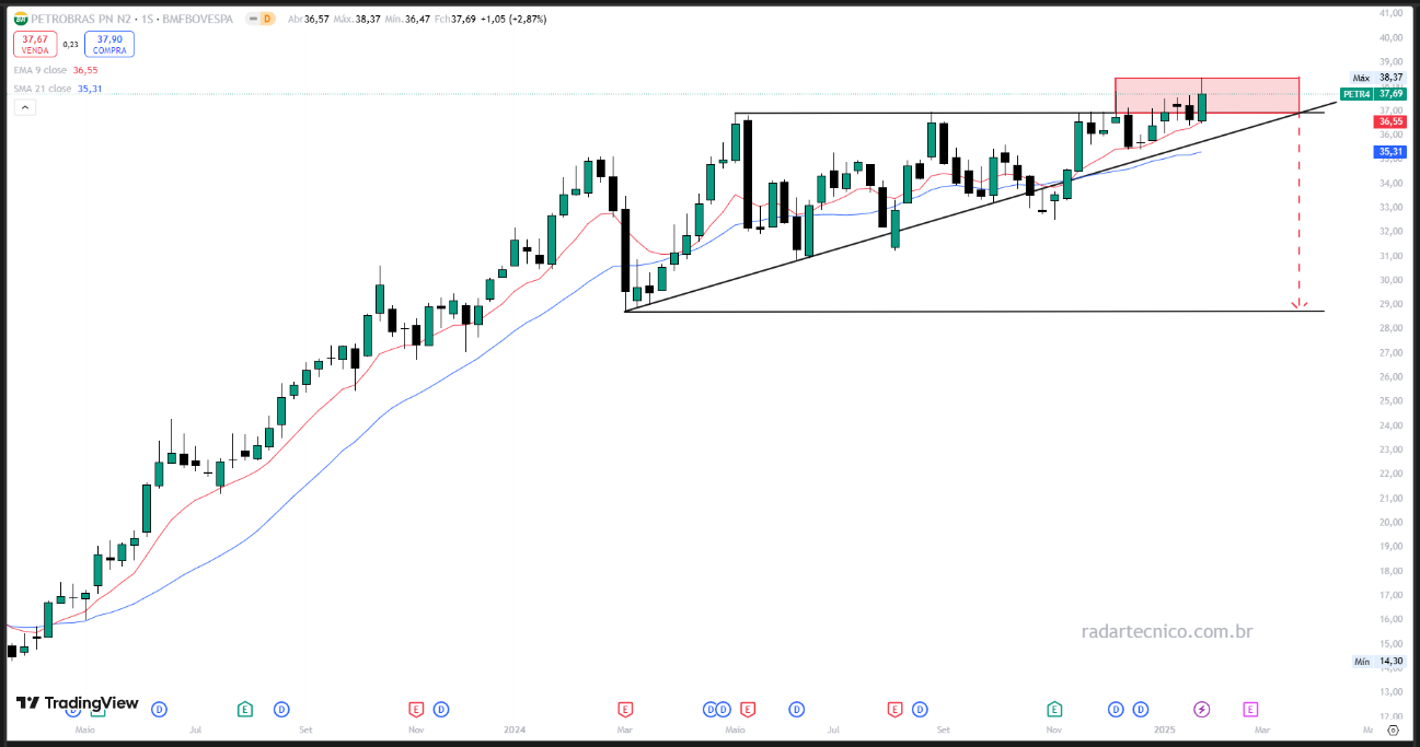 O ativo PETR4 fecha a semana em alta de +2,87%, cotado em R$ 37,69. Papel, mantém tendência altista e consegue fechar acima de resistência importante na região de R$ 37,15, o que pode ser entendido como uma busca de liquidez que precederá uma futura correção no preço, até região de fundo importante na região de R$ 28,73, no médio prazo.