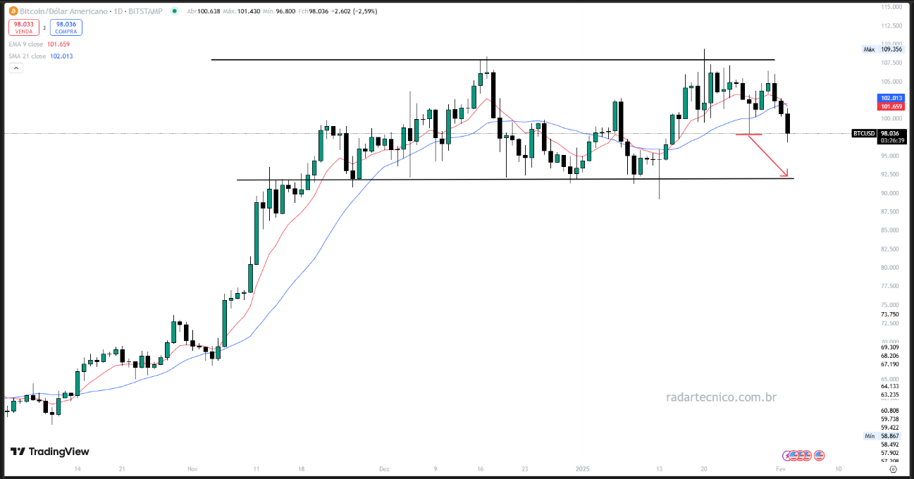 A expectativa de movimentação da criptomoeda ainda é baixista, devido ao contexto técnico de distribuição observado no gráfico diário. A perda da região dos $97.750,00 libera a correção até o suporte principal na região dos $91.971,00.