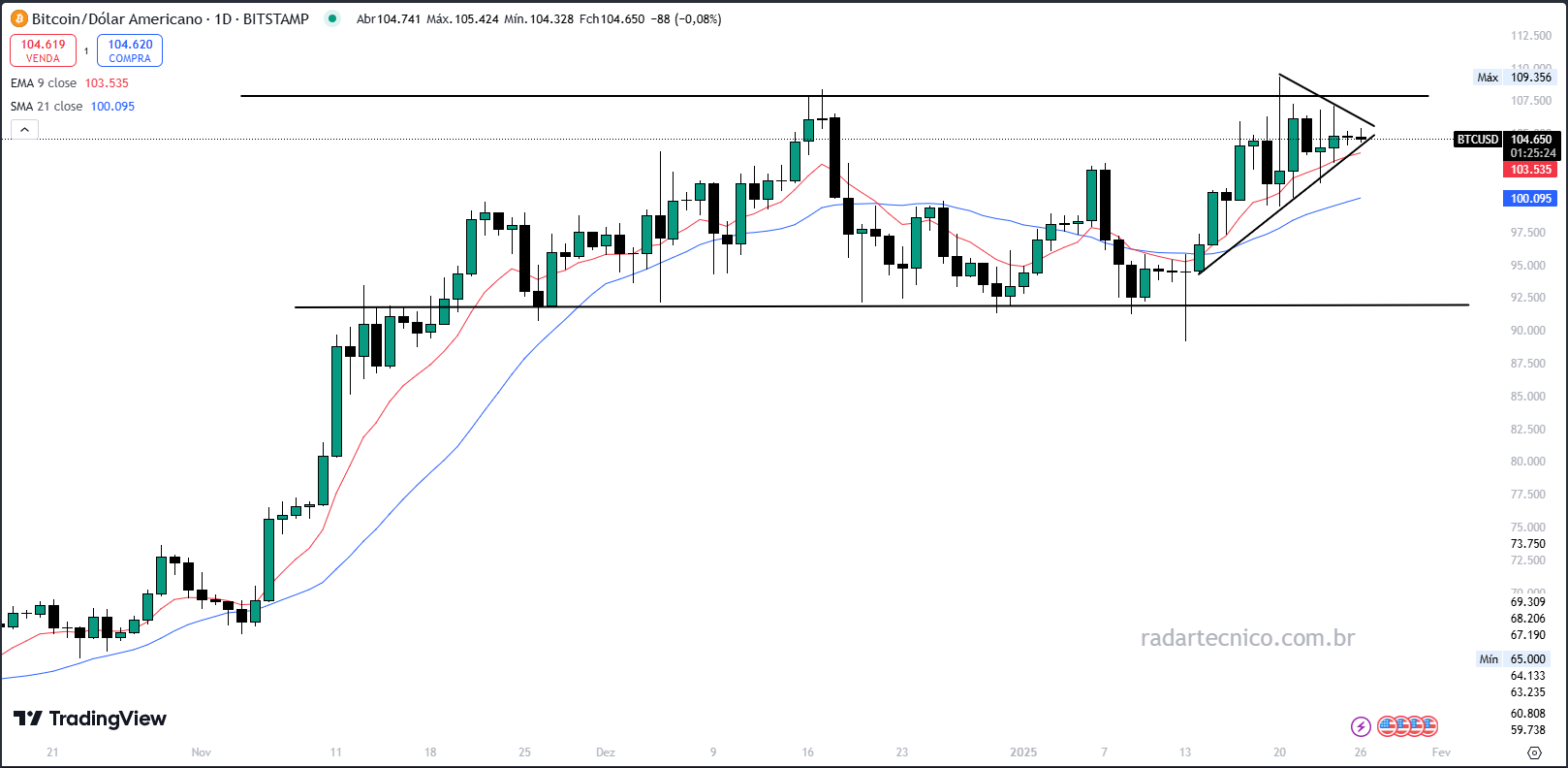 O Bitcoin hoje está cotado em região dos $104.618,00. A criptomoeda está em tendencia lateral no gráfico diário, oscilando entre valores de $91.971,00, região de suporte, e $108.018,00, região de resistência.