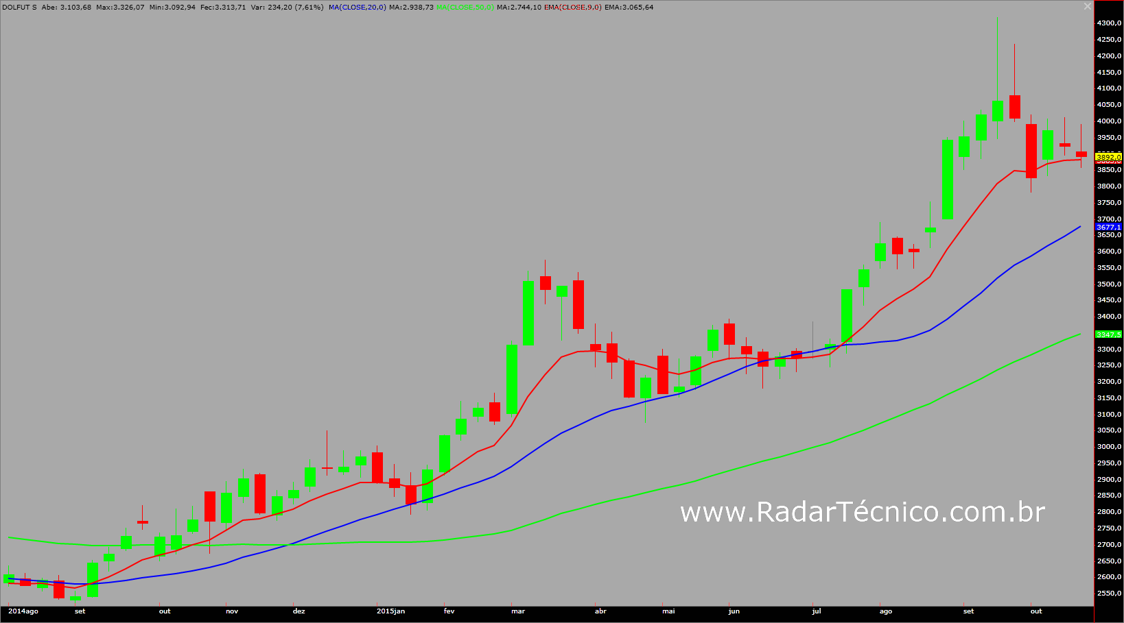 DOLFUT segue em tendência de alta, porém realiza pequena correção no preço recuando até a média móvel de 9 períodos. Para os próximos dias e semanas, seguimos com a expectativa de aproximação gradual do valor da moeda à sua média móvel de 20 períodos, situada em R$ 3,67.