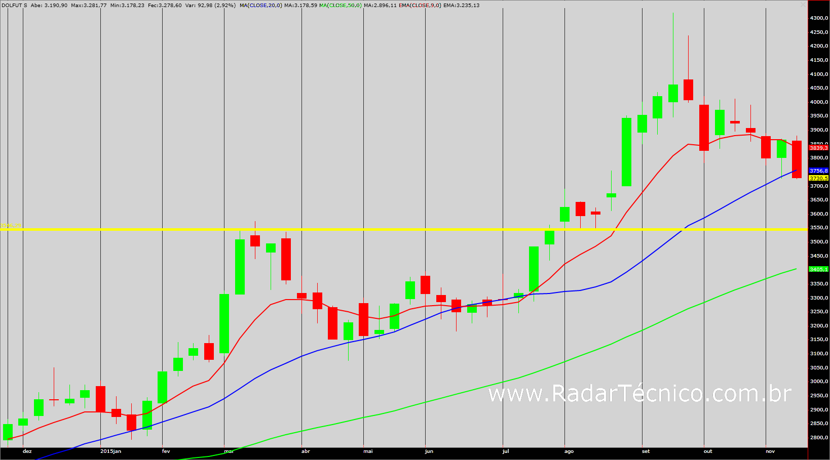 Dólar mantém tendência altista, porém esta última semana sofreu correção em seu preço, e fechou em R$ 3,73, ou seja, abaixo de sua média móvel de 20 períodos, atualmente localizada em R$ 3,75. Se ocorrer a perda da mínima deste último candle na próxima semana, teremos espaço para uma maior correção na moeda, com suporte localizado na região do último topo rompido em R$ 3,55.