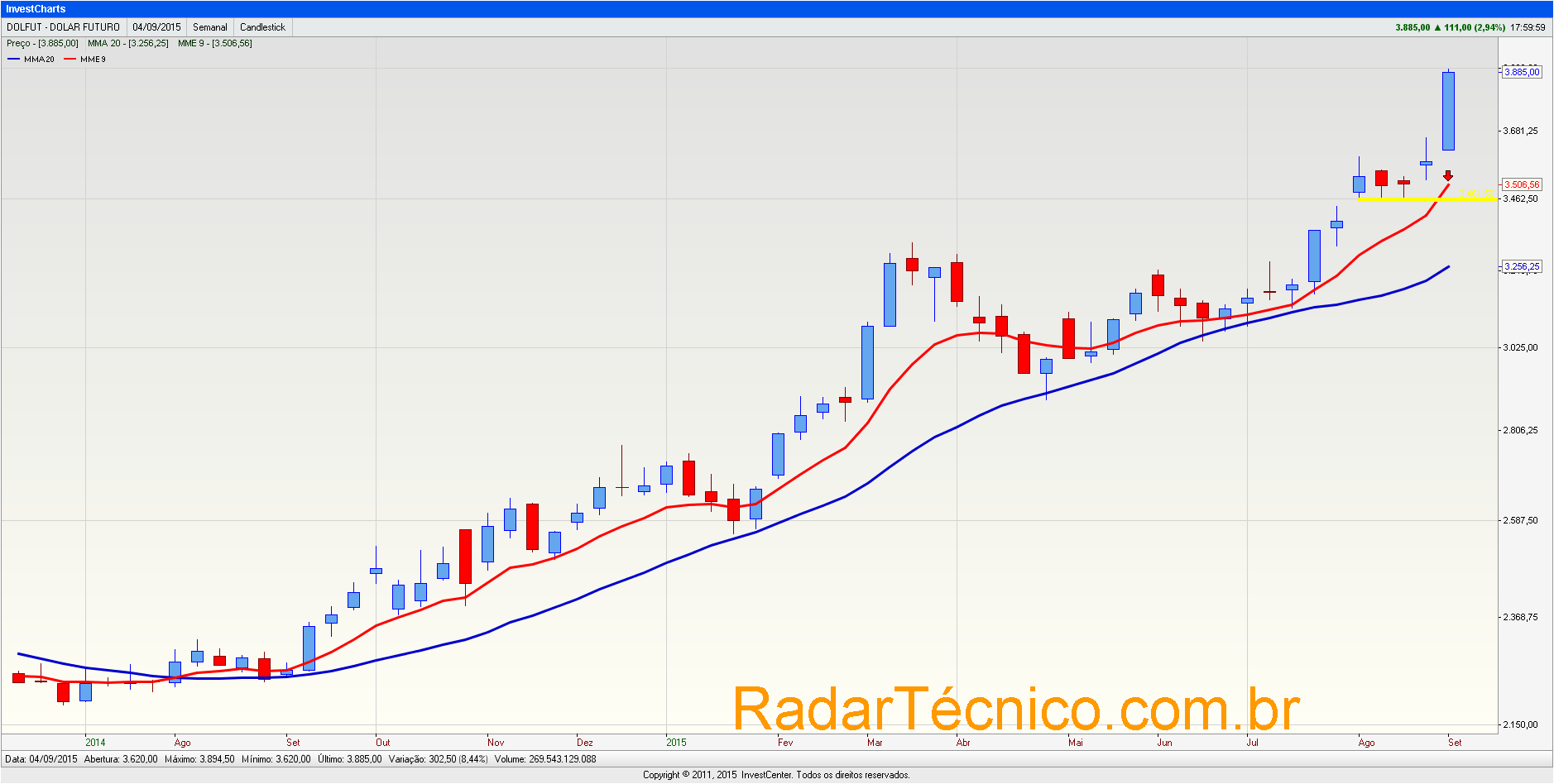 Dólar apresentou forte alta nesta última semana, formando um candle com fechamento perto da máxima. Contudo, o distanciamento do preço da moeda em relação à média móvel de 20 períodos sugere uma pequena correção nos preços, no mínimo até a média móvel de 9 períodos.