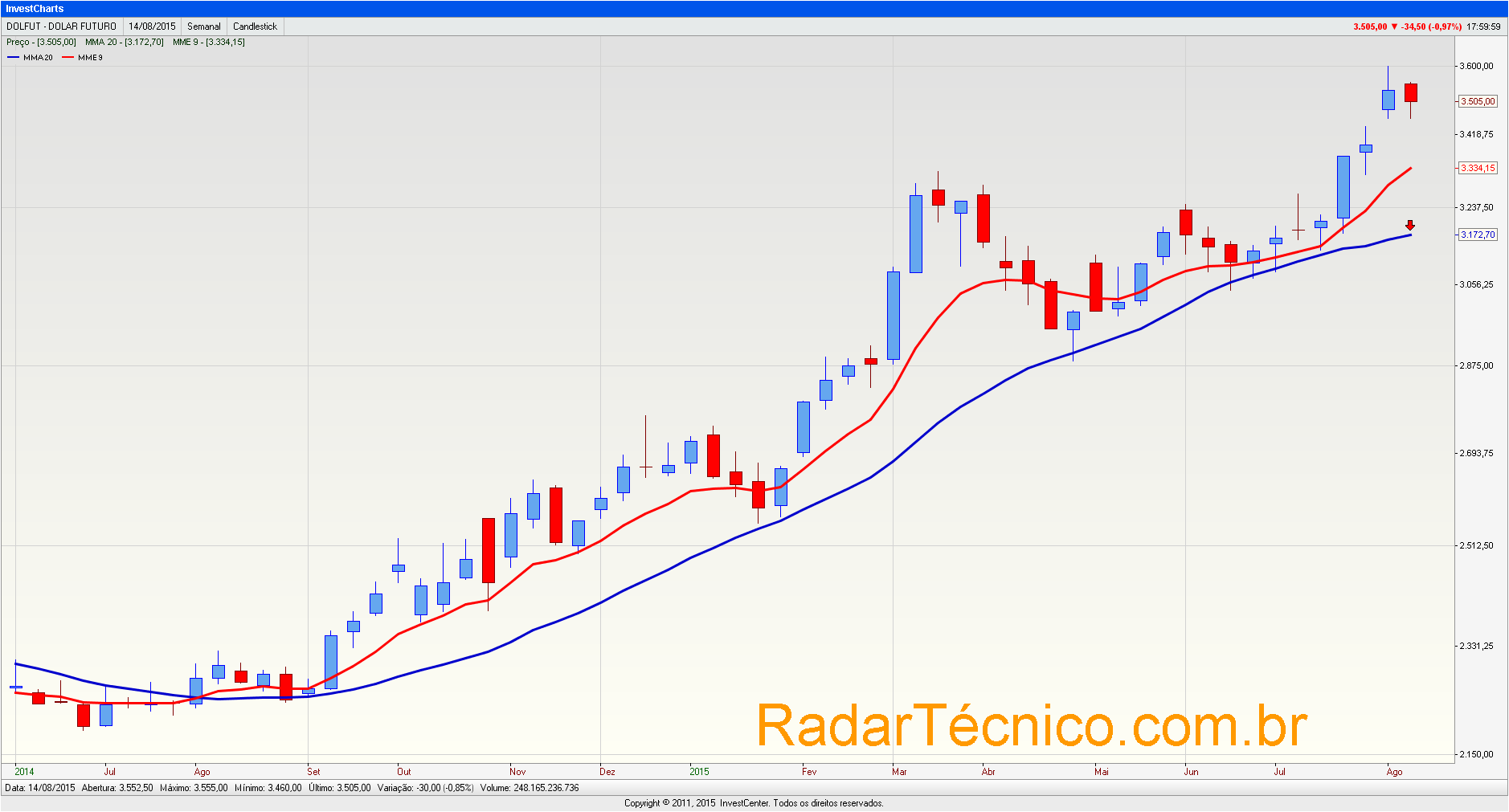 Dólar segue em tendência de alta de longo prazo. Porém o distanciamento do preço do ativo da média móvel de 20 períodos favorece uma pequena correção nos preços da moeda. Expectativa é a de continuação da movimentação altista, argumentada pelas médias móveis de 9 e 20 períodos ordenadas e ascendentes.