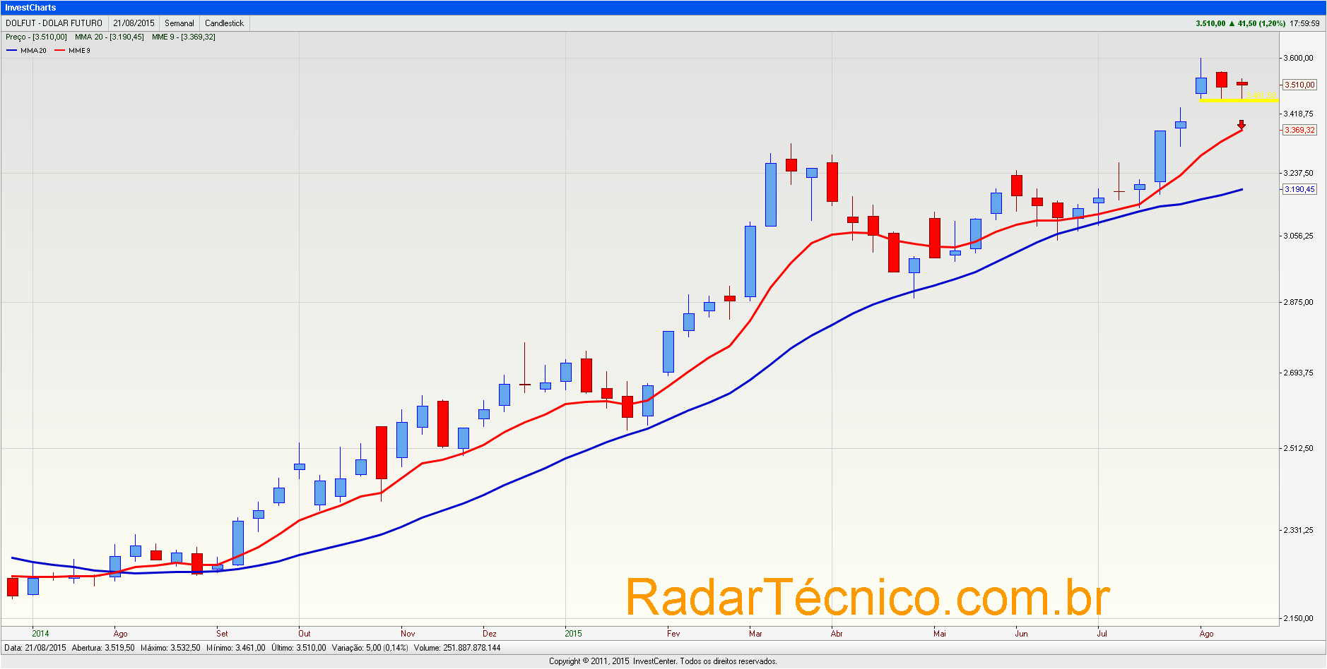 Dólar segue em tendência de alta. Apresentou nesta última semana movimentação lateral, característica de consolidação dos preços. Esta movimentação sugere uma pequena correção nos preços sem, contudo, indicar modificação de tendência.