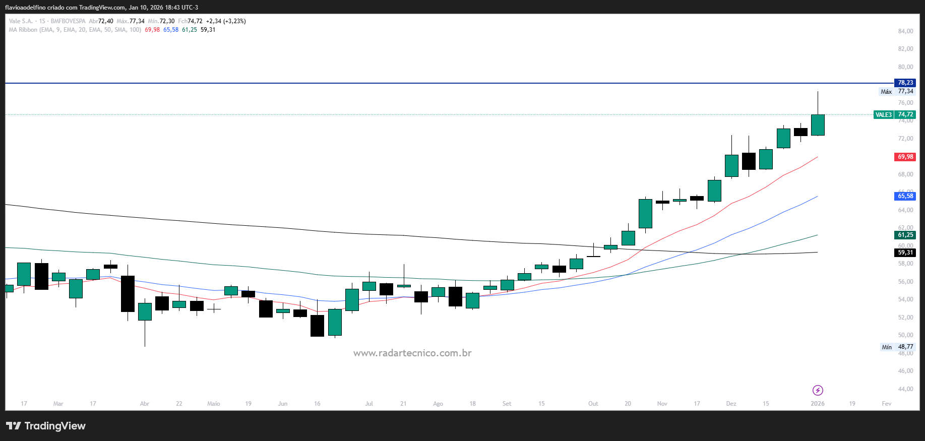 Complementando a visão fundamentalista, a análise técnica do ativo VALE3 reforça a perspectiva altista. O papel segue em uma forte tendência de alta, demonstrando resiliência mesmo após uma pequena correção na semana anterior (-1,01%). O fechamento da semana em alta de +3,23%, avaliado em R$74,72, sinaliza a retomada do ímpeto comprador.