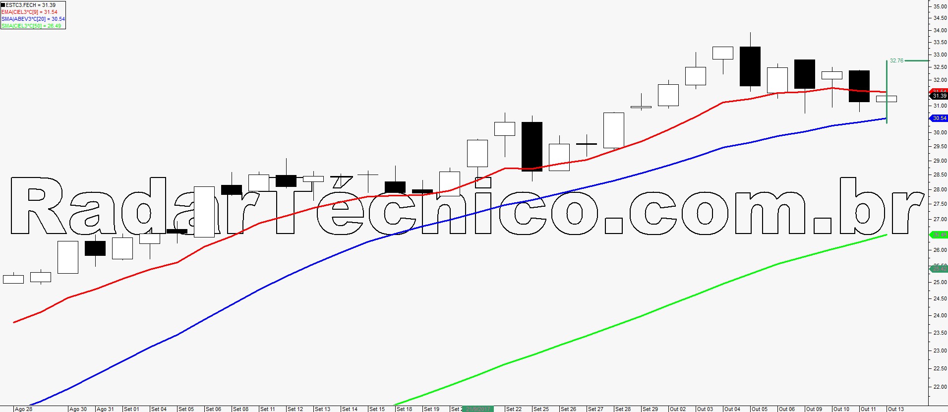 O papel ESTC3, no prazo diário, autoriza um possível trade, na superação de R$ 31,54 com alvo inicial em R$ 32,76 e stop posicionado em R$ 30,27.