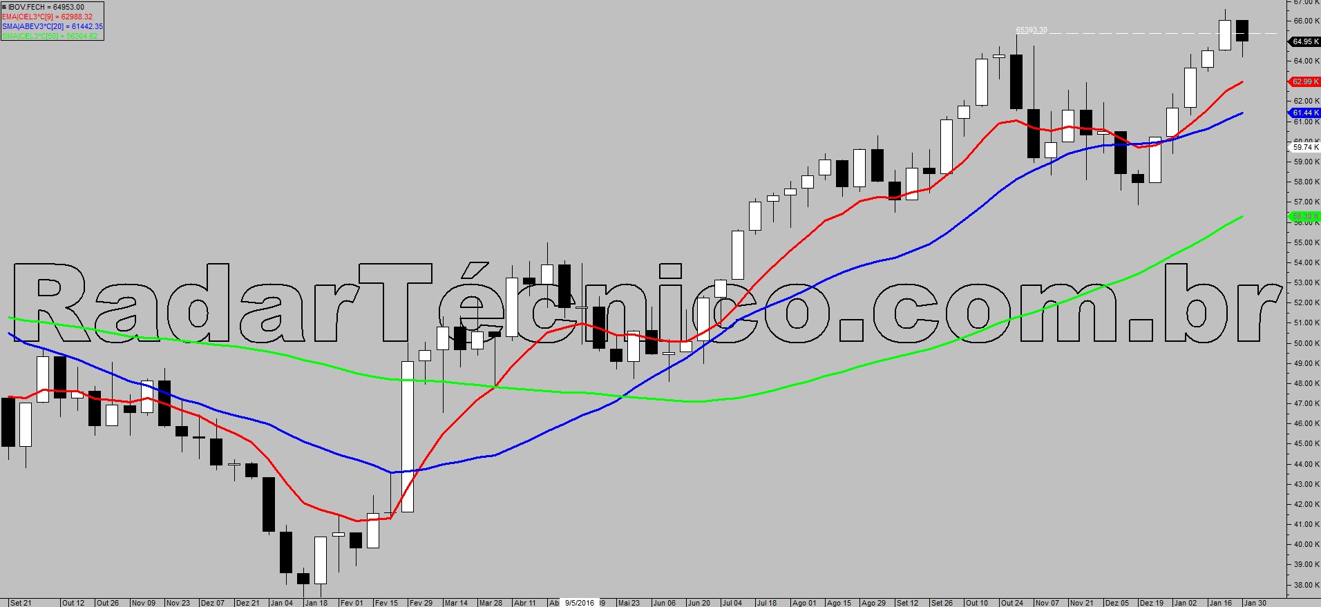 Índice Bovespa após performar cinco semanas consecutivas de alta e na semana anterior ultrapassar a máxima do ano passado, fecha a semana cotado em 64,95 mil pontos, ou seja, com 1,64 % de baixa em relação à semana anterior. Contudo, médias móveis de 9, 20 e 50 períodos, ordenadas e ascendentes sugerem manutenção da tendência de alta vigente no prazo semanal. Como primeiro suporte o índice possui a região dos 63 mil pontos, formado pela região de pequeno topo anterior e também pela média móvel de 9 períodos. Como resistência para o Bovespa temos a região dos 66,59 mil pontos fornecida pela máxima do ano.