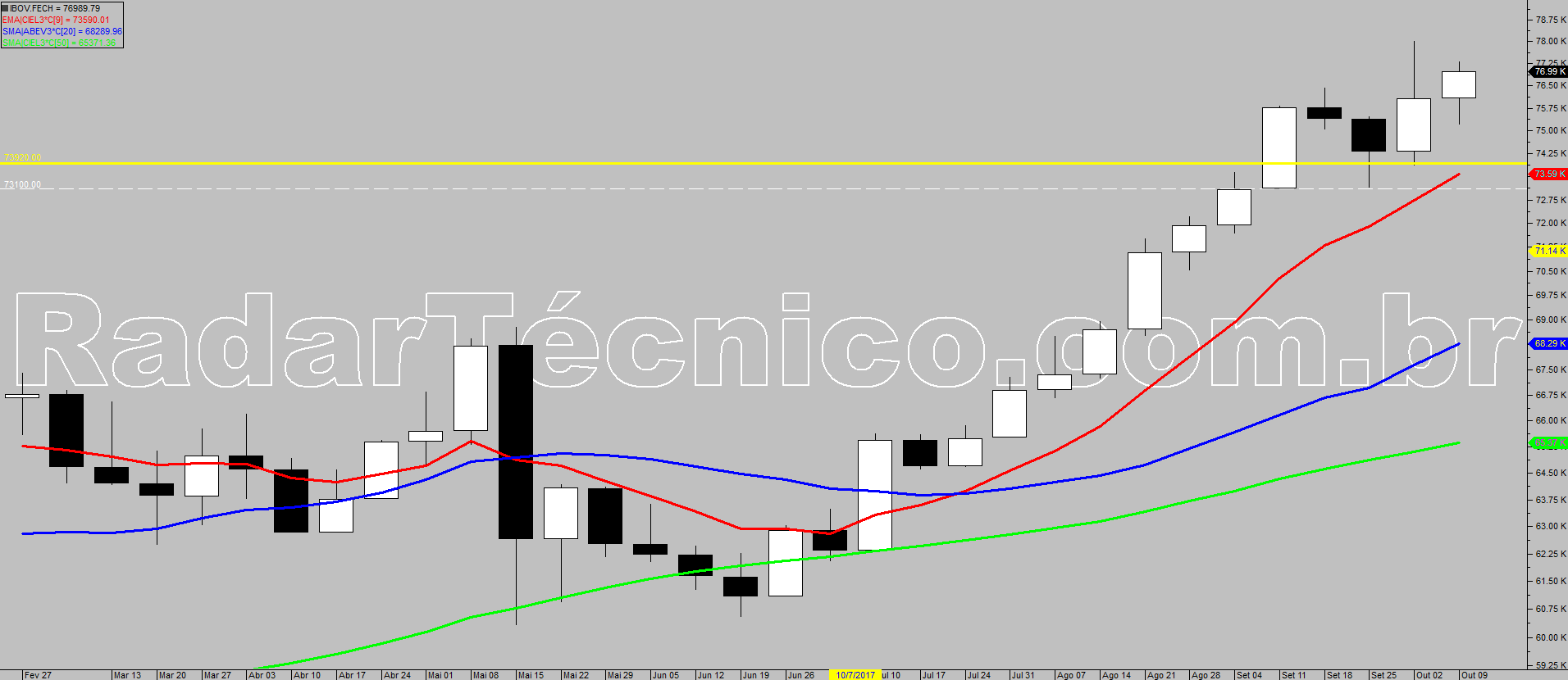Índice Bovespa fecha a semana cotado em 76,99 mil pontos, com 1,23% de alta em relação a semana passada. Sem apresentar sinais de reversão de tendência, Bovespa tem, como primeiro suporte, a região dos 73,92 mil pontos formado por topo anterior rompido e como resistência a região dos 78,02 mil pontos, fornecida pela máxima da semana anterior.