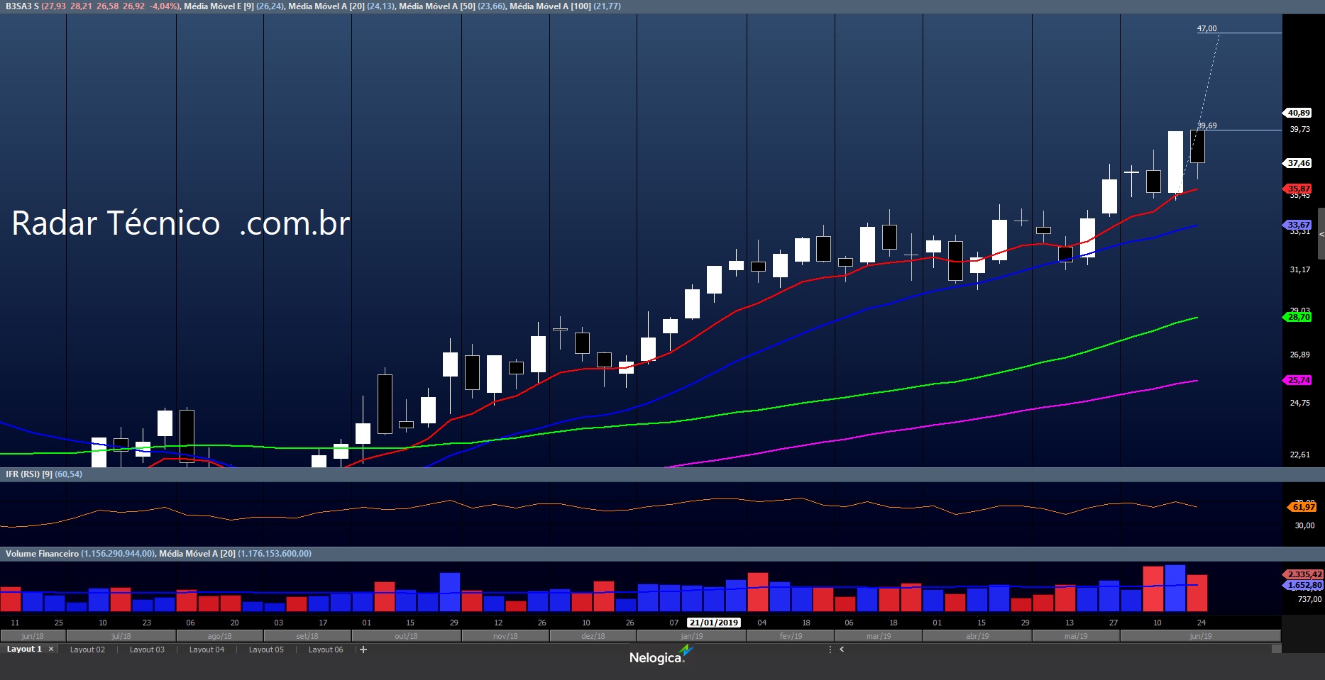 O papel B3SA3, autoriza um possível trade, na superação de R$ 39,75, com alvo em R$ 47,00 e stop posicionado em R$ 36,38.