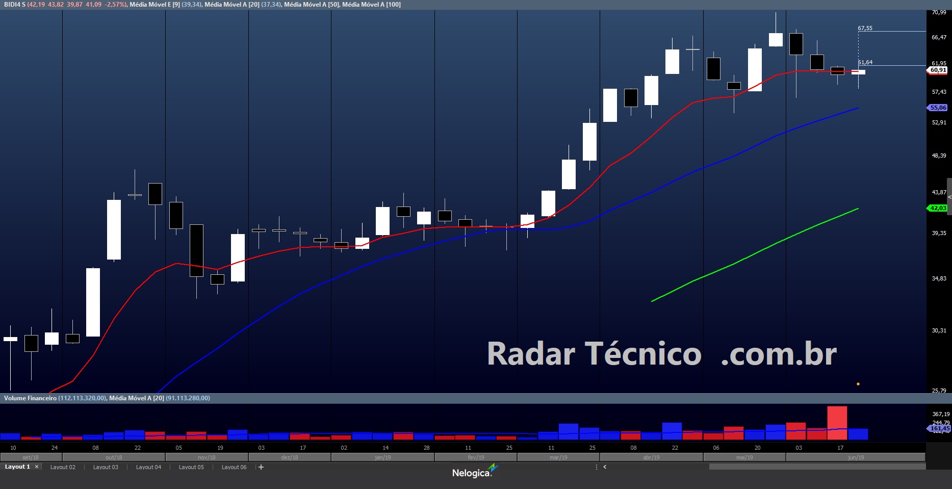 O papel BIDI4, poderá possibilitar entrada, na superação de R$ 61,82, com alvo em R$ 67,55 e stop posicionado em R$ 57,88.