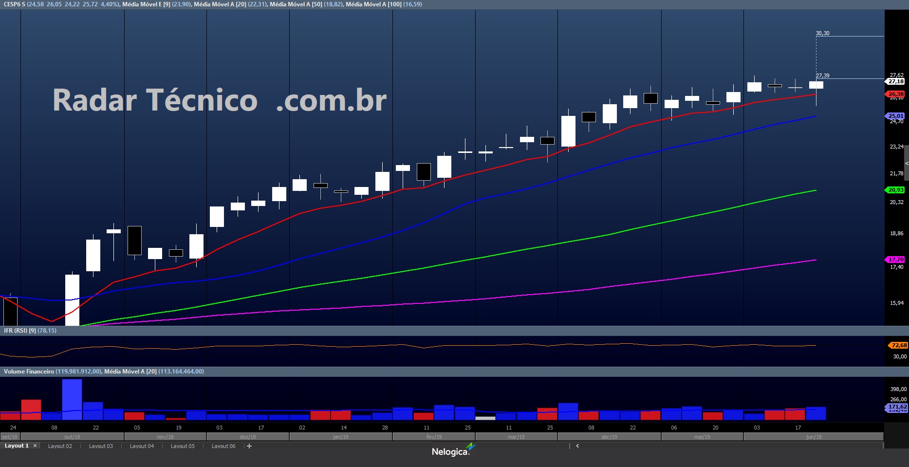 O papel CESP6, com médias móveis de 9, 20, 50 e 100 períodos ordenadas e ascendentes, possibilitará entrada, na superação de R$ 27,47, com alvo em R$ 30,30 e stop posicionado em R$ 25,58.