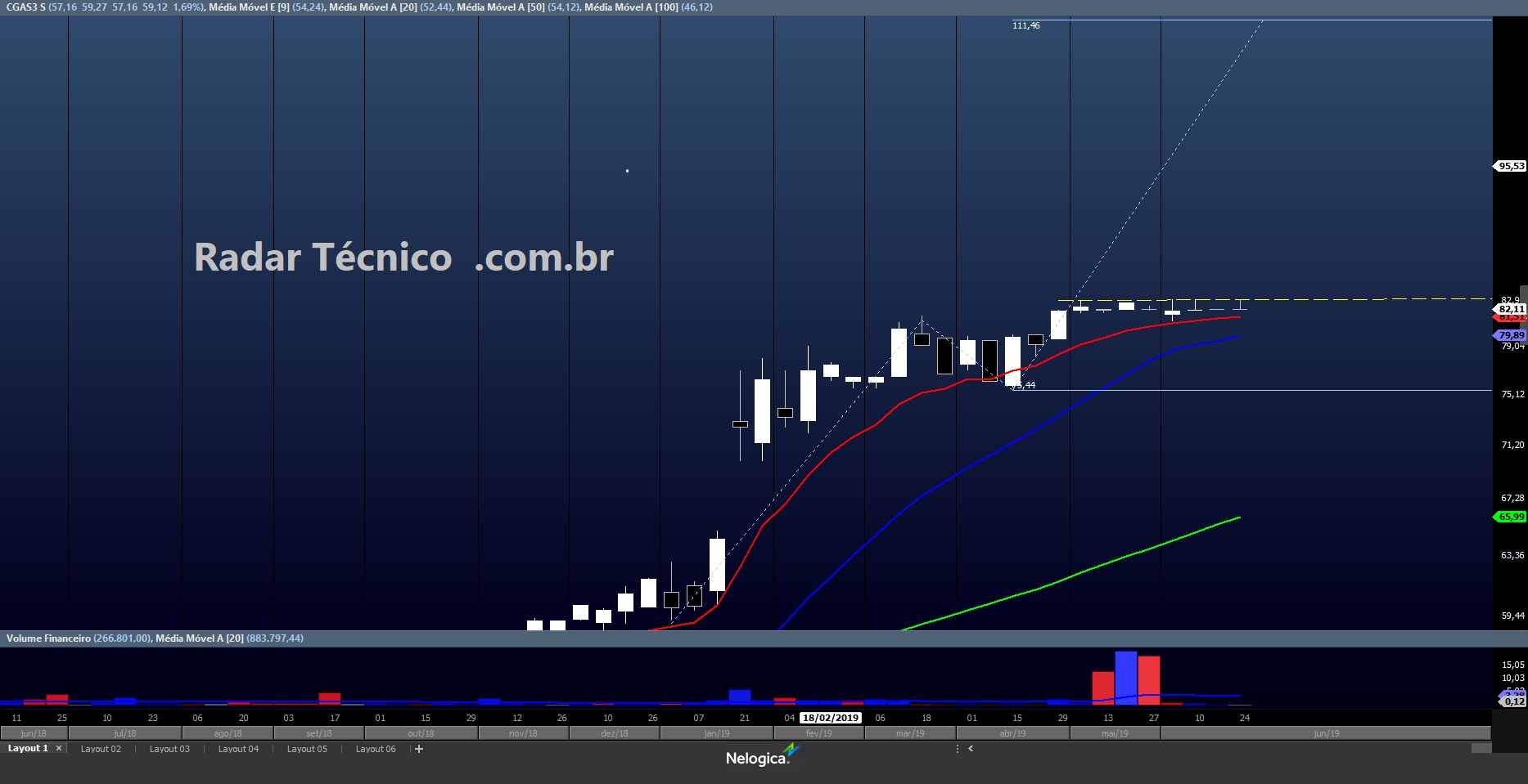 O ativo CGAS3, poderá possibilitar um trade, no prazo semanal, na superação de R$ 83,00, com alvo em R$ 111,46 e stop posicionado em R$ 80,90.