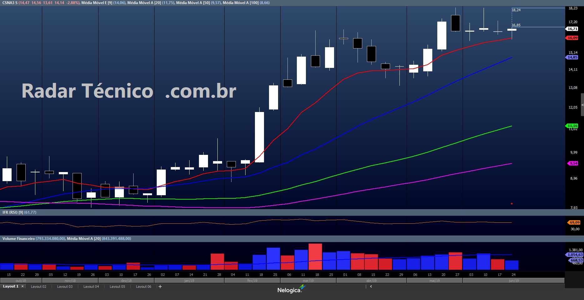 O papel CSNA3, com médias móveis de 9, 20, 50 e 100 períodos ordenadas e ascendentes, autoriza um possível trade, na superação de R$ 16,80, com alvo em R$ 18,24 e stop posicionado em R$ 15,97.