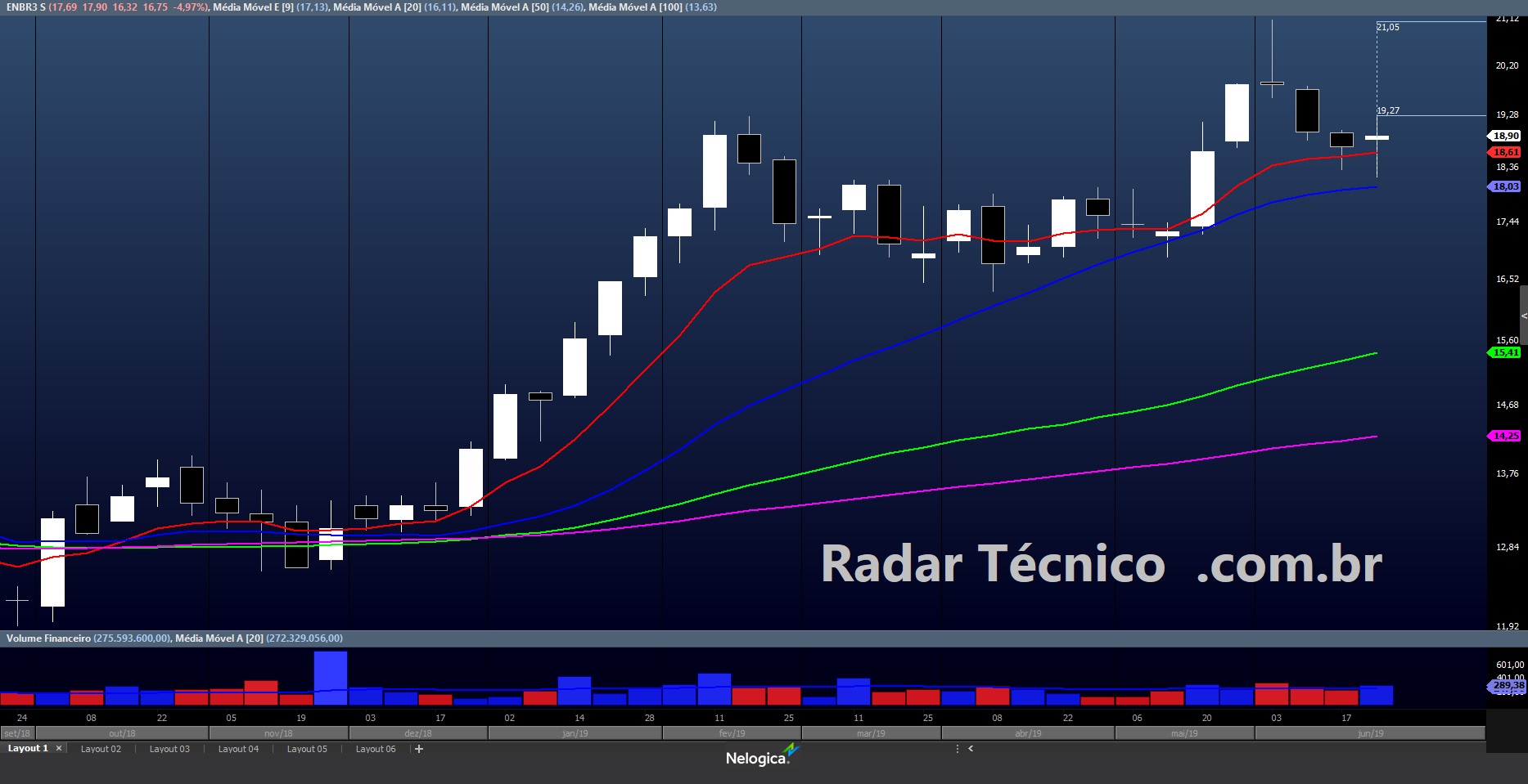 O papel ENBR3, autoriza um possível trade, na superação de R$ 19,28, com alvo em R$ 21,05 e stop posicionado em R$ 18,15.