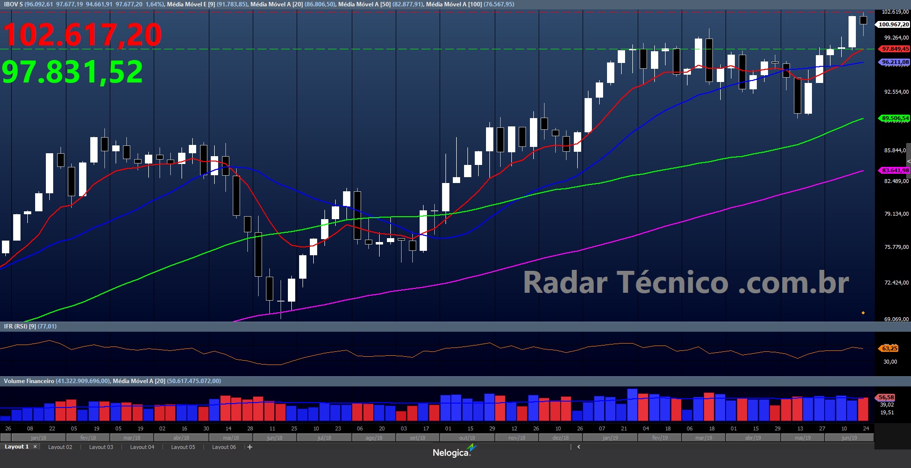 Índice Bovespa encerra a semana cotado em 100,9 mil pontos, com 1,02% de queda depois de cinco semanas consecutivas de alta. Contudo, apesar desta pequena correção, não há evidencia de mudança do cenário altista no curto e médio prazo. Como resistência, temos a nova máxima em região dos 102,6 mil pontos, e como suporte os 97,8 mil pontos, fornecido por máximas anteriores e pela média móvel de 9 períodos.