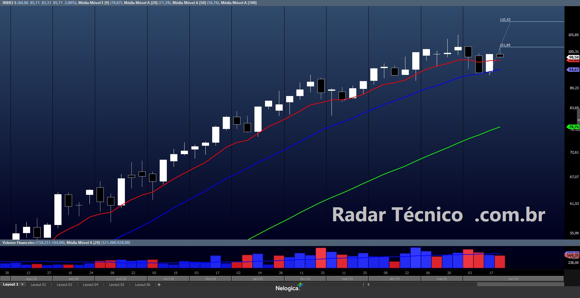O papel IRBR3, poderá autorizar um trade, na superação de R$ 102, com alvo em R$ 110,53 e stop posicionado em R$ 93,08.