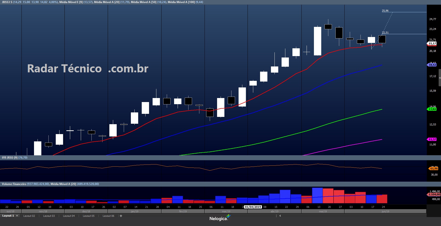 O papel JBSS3, promoverá possível entrada, na superação de R$ 22,55, com alvo em R$ 25,96 e stop posicionado em R$ 20,66.