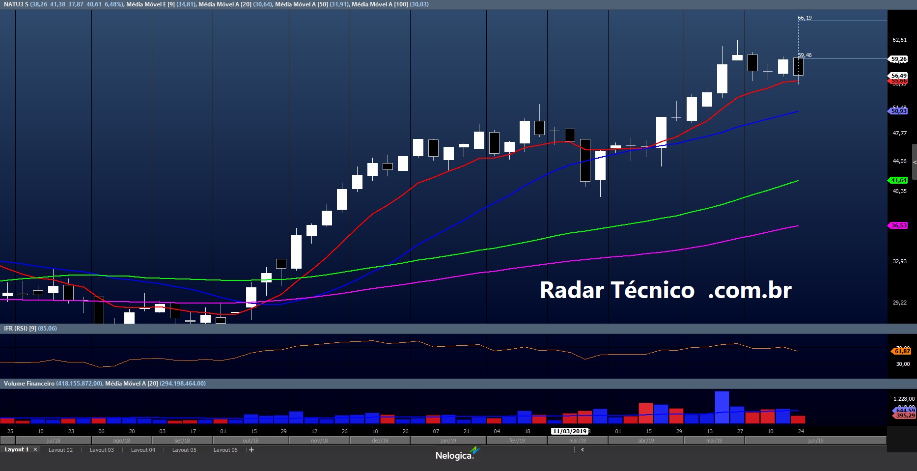 O papel NATU3, com médias móveis de 9, 20, 50 e 100 períodos ordenadas e ascendentes, autoriza um possível trade, na superação de R$ 59,48, com alvo em R$ 66,19 e stop posicionado em R$ 54,98.