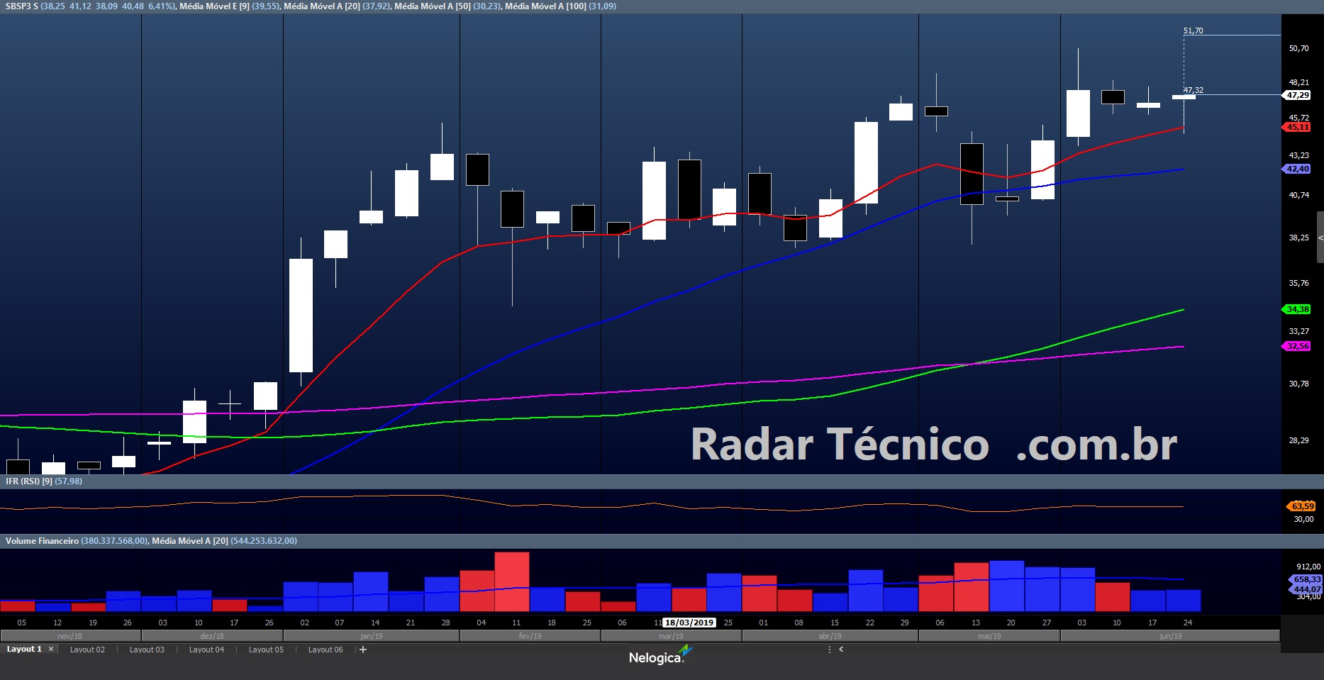 O papel SBSP3, sinaliza um possível trade, na superação de R$ 47,36, com alvo em R$ 51,70 e stop posicionado em R$ 44,58.