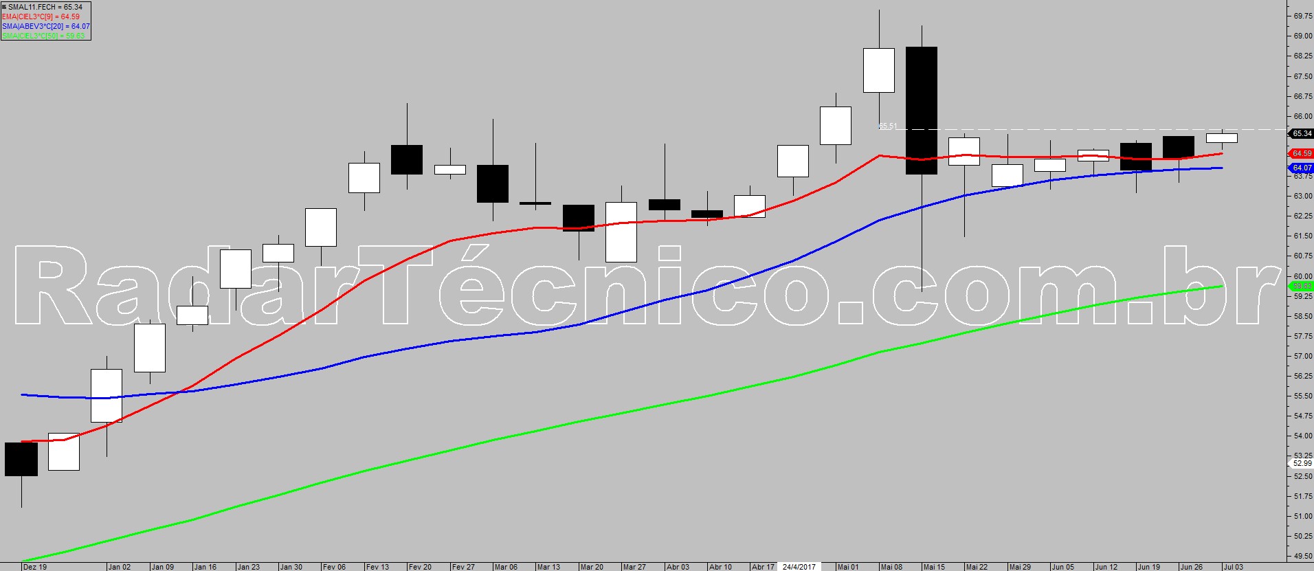 O papel SMAL11 com médias móveis de 9, 20 e 50 períodos ordenadas e ascendentes, poderá permitir um trade pelo setup da média móvel de 9, na superação de R$ 65,51 e stop posicionado em R$ 64,68.