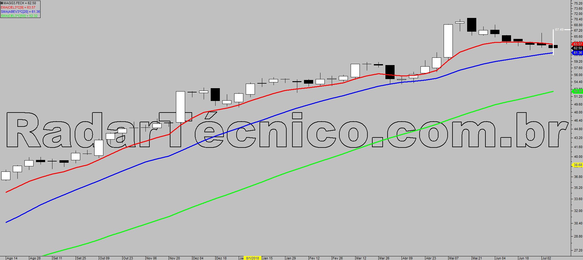 O papel MAGG3, com médias móveis de 20 e 50 períodos ordenadas e ascendentes, sinaliza um provável trade, na superação de R$ 63,34 com alvo inicial em R$ 67,49 e stop posicionado em R$ 60,47.