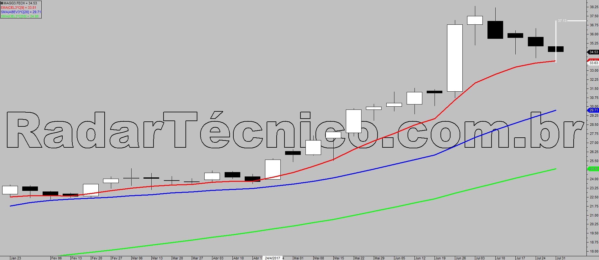 O papel MAGG3 encontra-se com médias móveis de 9, 20 e 50 períodos ordenadas e ascendentes, admitindo um possível trade pelo setup de ponto contínuo na superação de R$ 35,39 com alvo inicial em R$ 37,13 e stop posicionado em R$ 33,58.