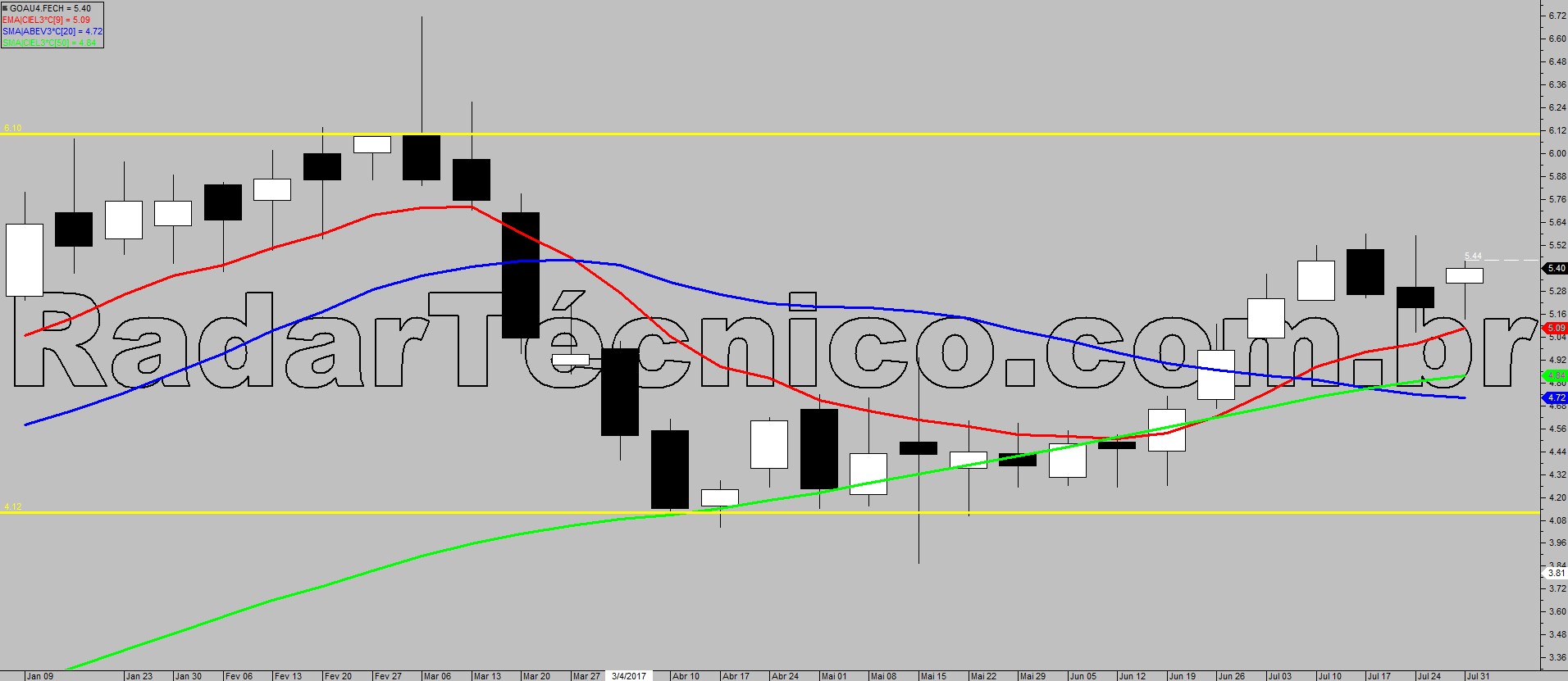 O papel GOAU4, permite um possível trade seguidor de tendência na superação de R$ 5,44 com alvo inicial em R$ 5,87 e stop posicionado em R$ 5,08.