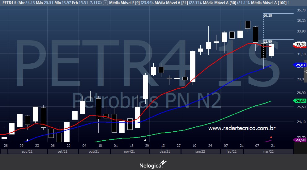 Gráfico semanal de Petrobras, em tendência de alta no momento, com médias moveis de 9, 21 e 50 alinhadas, poderá possibilitar um trade, na superação de R$ 32,89, com alvo em R$36,28 e stop posicionado em R$ 29, 44.