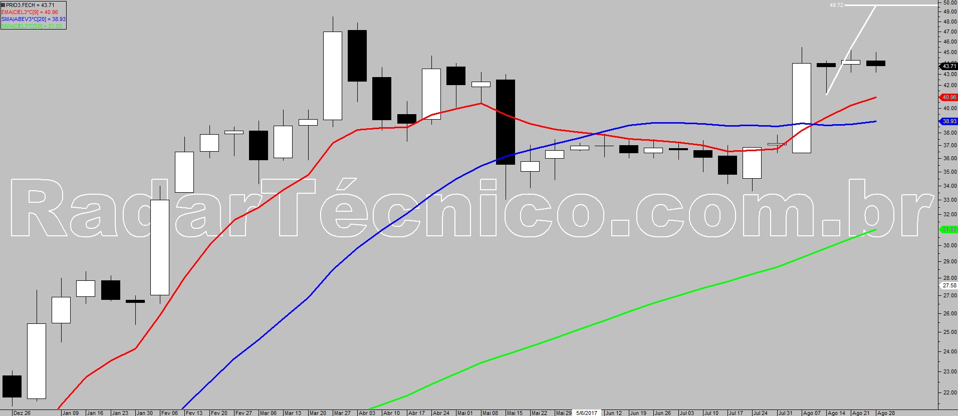O ativo PRIO3 autoriza um possível trade pelo setup de realização frustrada, na superação de R$ 45,40 com alvo inicial em R$ 49,72 e stop posicionado em R$ 41,11.
