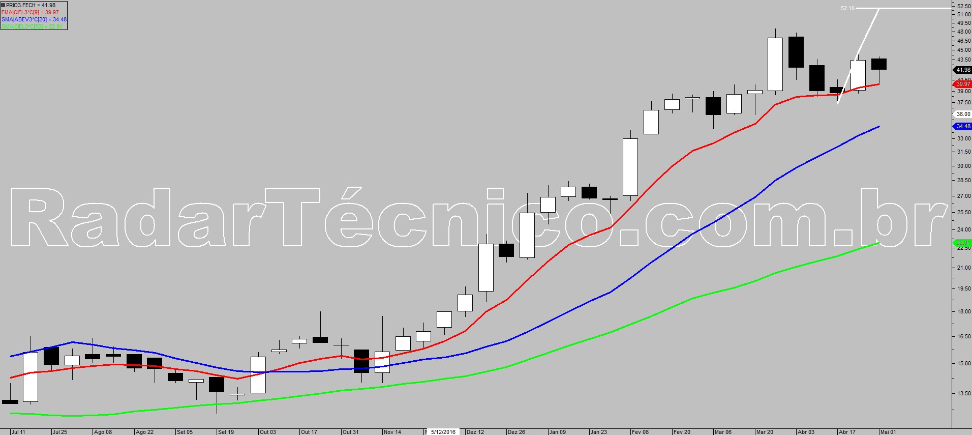 O ativo PRIO3 encontra-se com médias móveis de 9, 20 e 50 períodos ordenadas e ascendentes, autorizando um possível trade pelo setup de realização frustrada, na superação de R$ 44,69, com alvo inicial em R$ 52,10 e stop posicionado em R$ 37,24.