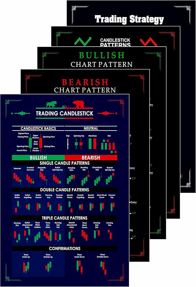 Conjunto de 5 pôsteres de padrões de candles para negociação. (tamanho: 30 x 21 cm, sem moldura).