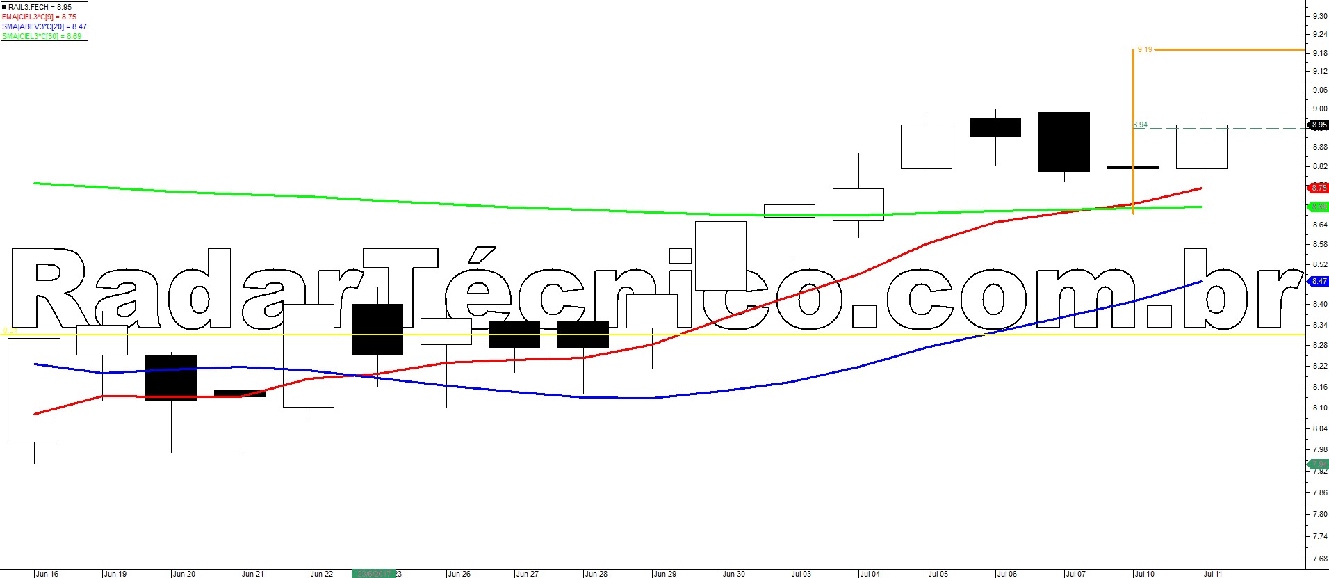 O ativo RAIL33, no prazo diário, encontra-se com médias móveis de 9, 20 e 50 períodos ascendentes, autorizando um possível trade pelo setup da média móvel de 09, na superação de R$ 8,93, com alvo inicial em R$ 9,19 e stop posicionado em R$ 8,64.