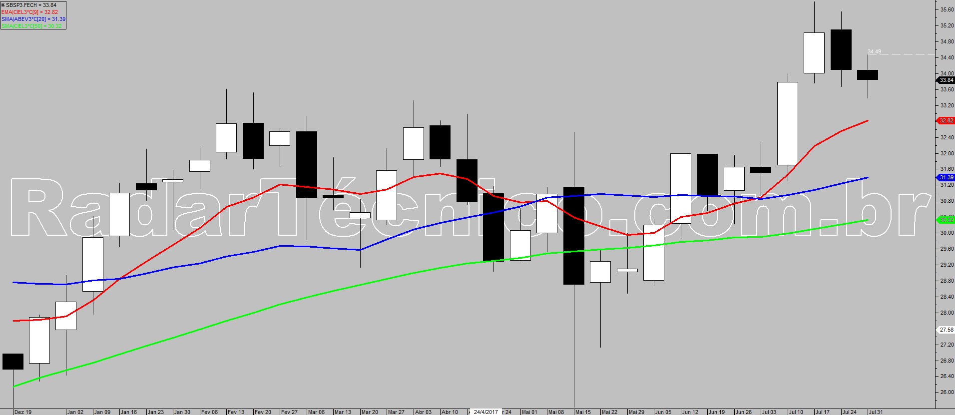 O papel SBSP3 encontra-se com médias móveis de 9, 20 e 50 períodos ordenadas e ascendentes, permitindo um possível trade seguidor de tendência na superação de R$ 34,49 com alvo inicial em R$ 37,24 e stop posicionado em R$ 33,34.