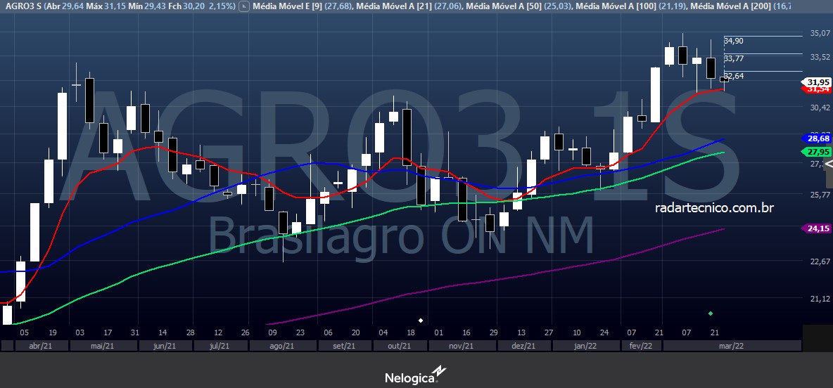 Brasilagro, com médias moveis de 9, 21 e 50 ascendentes e alinhadas, poderá possibilitar um trade, na superação de R$ 32,64, com alvo em R$ 34,90 e stop posicionado em R$ 31,38.