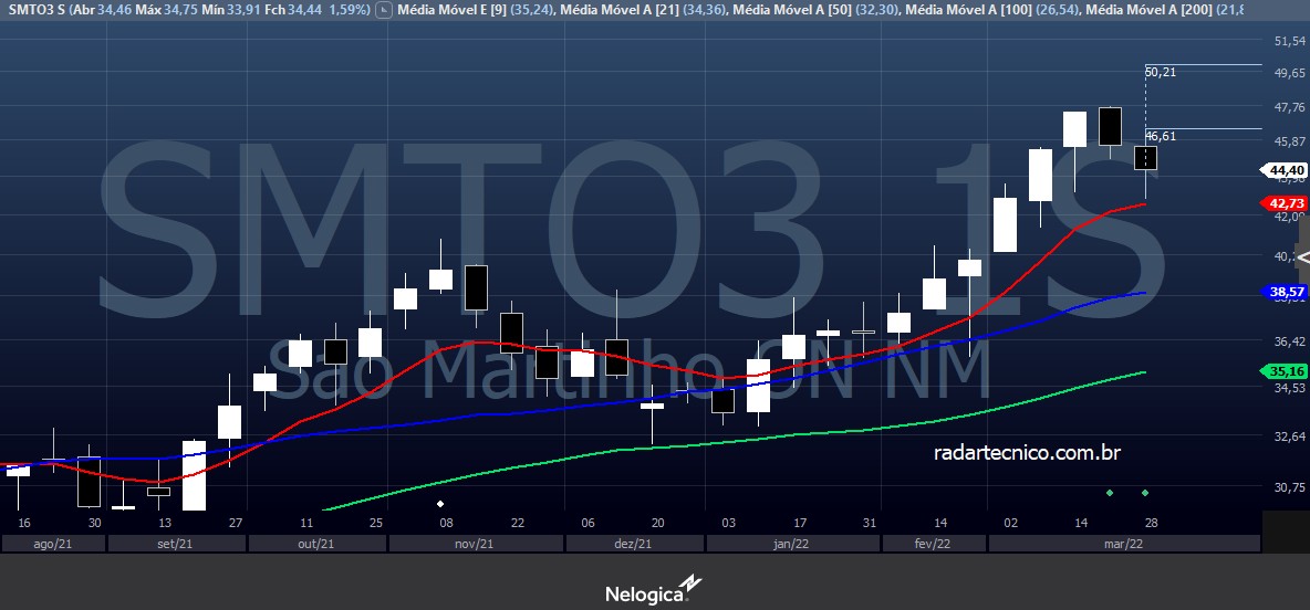 São Martinho, com médias moveis de 9, 21 e 50 ascendentes e alinhadas, poderá possibilitar uma posição, na superação de R$ 46,62, com alvo em R$ 50,21 e stop posicionado em R$ 42,88.