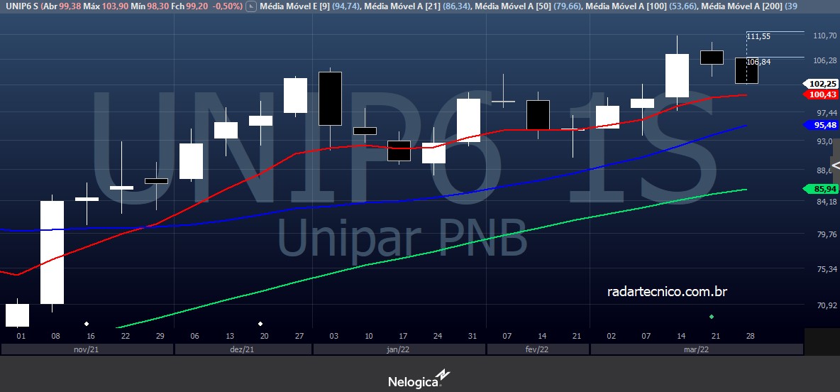 Unipar, com médias moveis de 9, 21 e 50 ascendentes e alinhadas, poderá possibilitar um trade, na superação de R$ 106,84, com alvo em R$ 111,55 e stop posicionado em R$ 102,18.