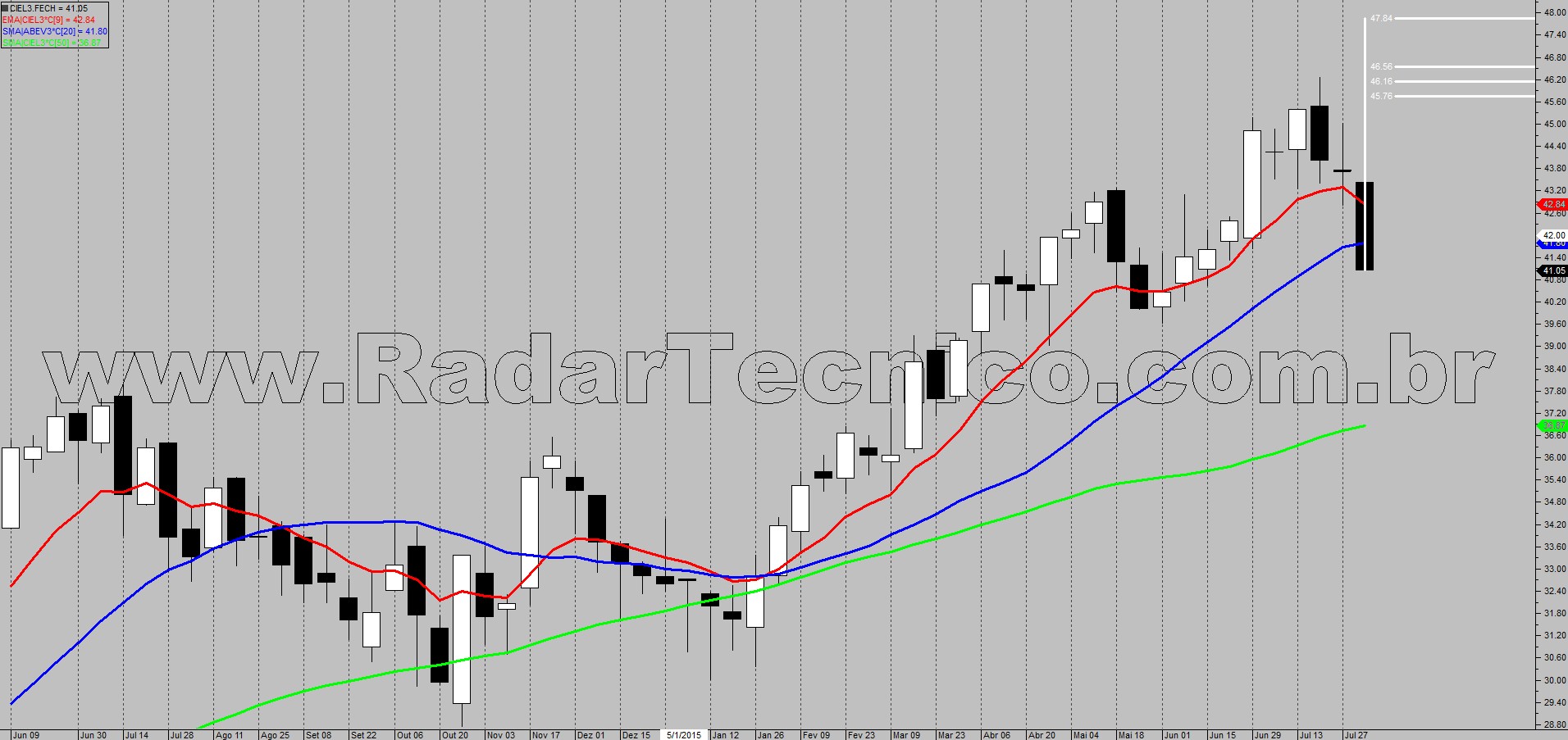 Pelo gráfico semanal, o papel CIEL3 encontra-se numa tendência primária de alta, com médias móveis de 20 e 50 períodos ordenadas e ascendentes. O ativo acionará setup de Ponto Contínuo na mm de 20 períodos se atingir o ponto de entrada localizado na superação de R$ 44,46, alvo de R$ 47,84 e stop em R$ 41,04.