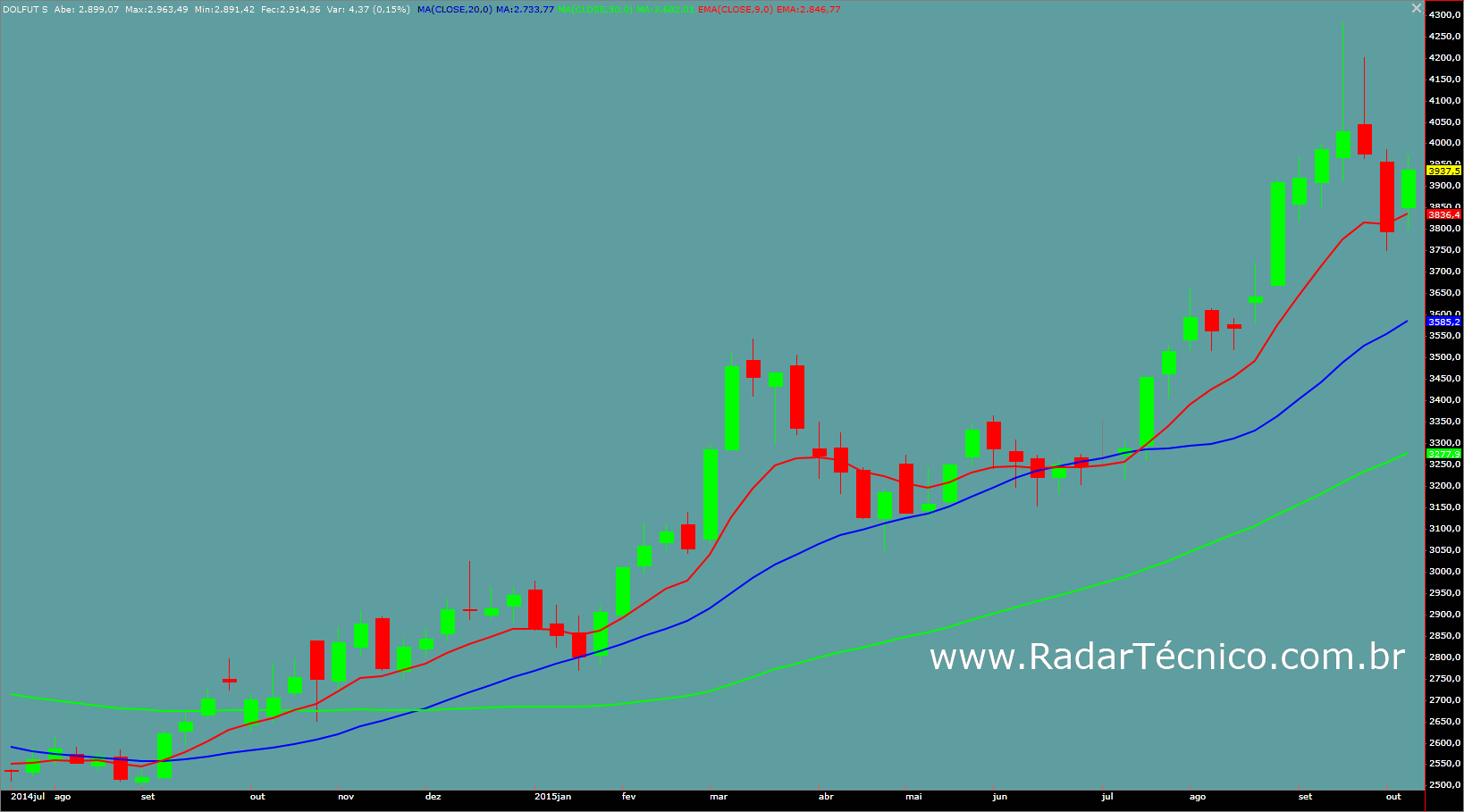 Dólar ainda em tendência de alta, fechando a semana cotado em R$ 3,88. Moeda voltou a fechar acima de sua média móvel de vinte períodos e sombra inferior do último candle demonstra regência de força compradora. Contudo, a perda da mínima da semana anterior cria uma indefinição quanto direção da moeda para as próximas semanas. Sob esta ótica, duas situações gráficas possíveis se apresentam, sendo a primeira, a ocorrência de nova perda da mínima deste último candle na próxima semana, possibilitando uma correção na moeda até o suporte localizado na região do último topo rompido em R$ 3,55. A segunda situação gráfica possível seria a ocorrência da superação de R$ 3,92, com o alvo projetado localizado em R$ 4,10.