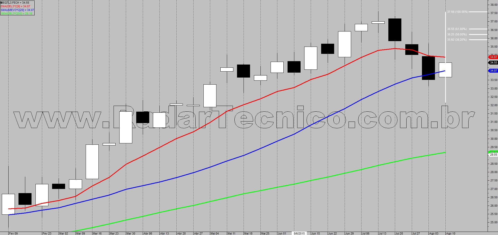 Pelo gráfico semanal, o papel EQTL3 encontra-se numa tendência primária de alta, com médias móveis de 20 e 50 períodos ordenadas e ascendentes. O ativo apresentou correção nos preços e acionará setup de Ponto Contínuo se atingir o ponto de entrada na superação de R$ 35,70, alvo de R$ 38,33 e stop em R$ 33,09.