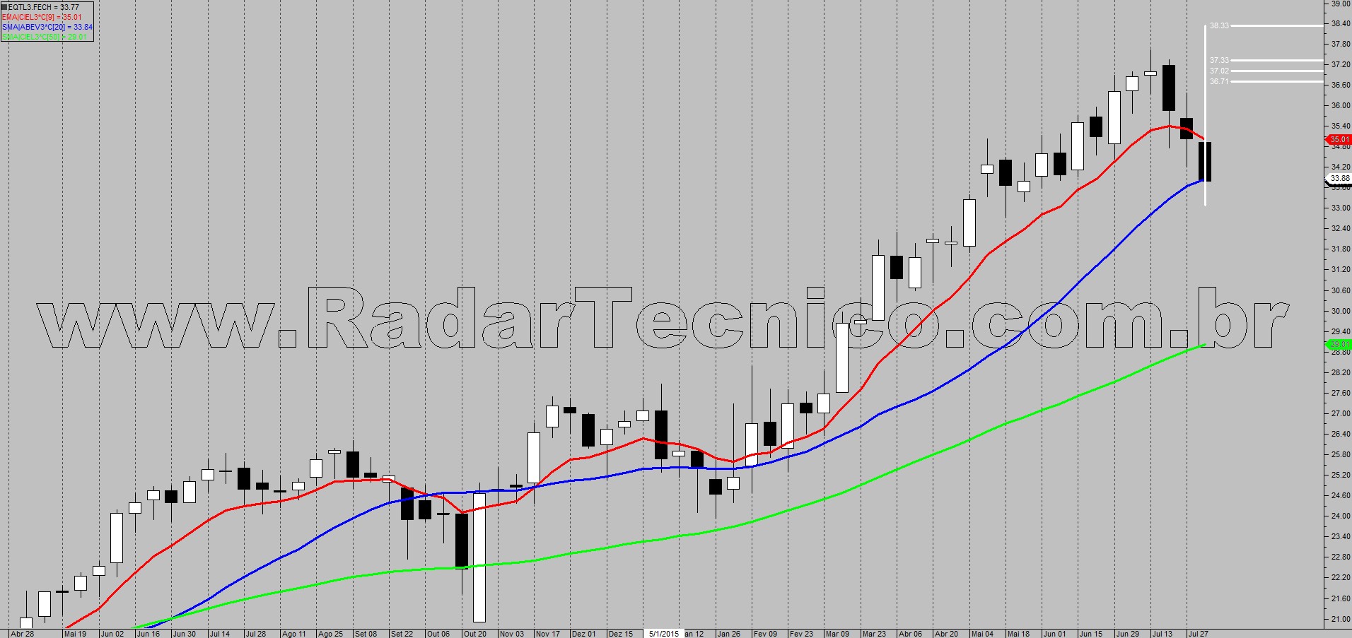 O ativo EQTL3 encontra-se numa tendência primária de alta, com médias móveis de 9, 20 e 50 períodos ordenadas e ascendentes. O papel acionará setup de Ponto Contínuo na mm de 20 períodos se atingir o ponto de entrada localizado na superação de R$ 36,21, alvo de R$ 39,50 e stop em R$ 32,89.