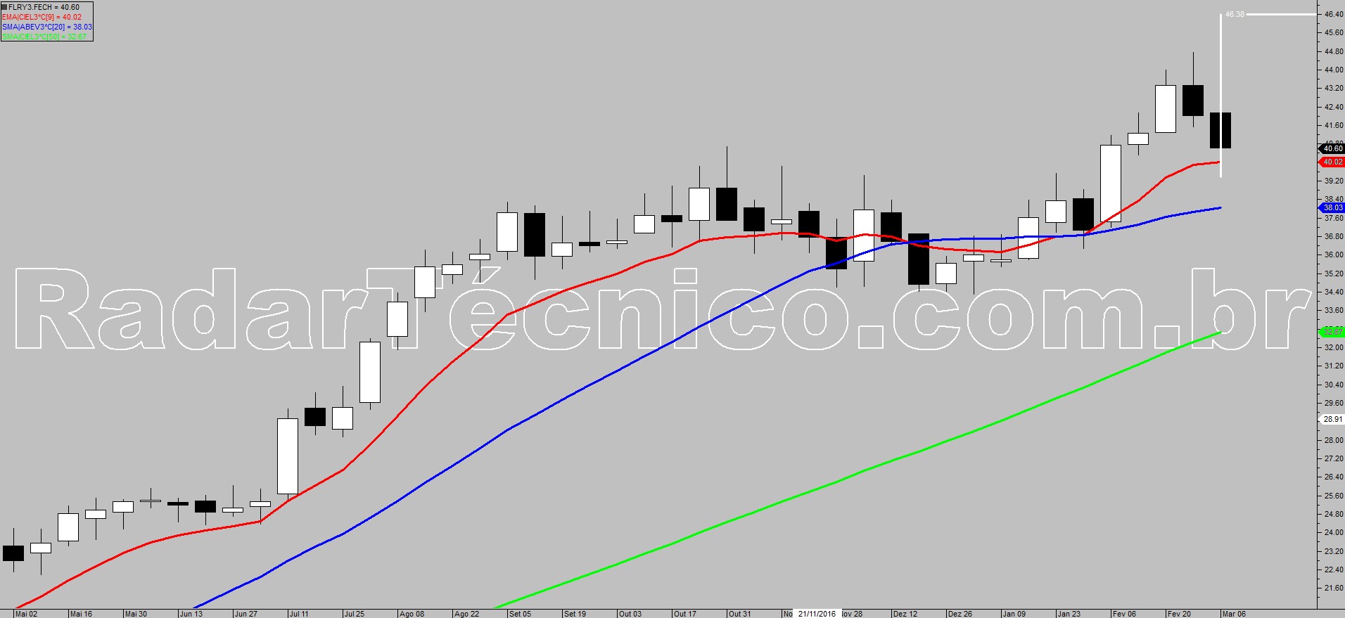 O ativo FLRY3 encontra-se com médias móveis de 9, 20 e 50 períodos ordenadas e ascendentes, autorizando um possível trade pelo setup de pullback em estrutura de retângulo de topo, na superação de R$ 43,15 , com alvo inicial em R$ 49,65 e stop posicionado em R$ 38,98.