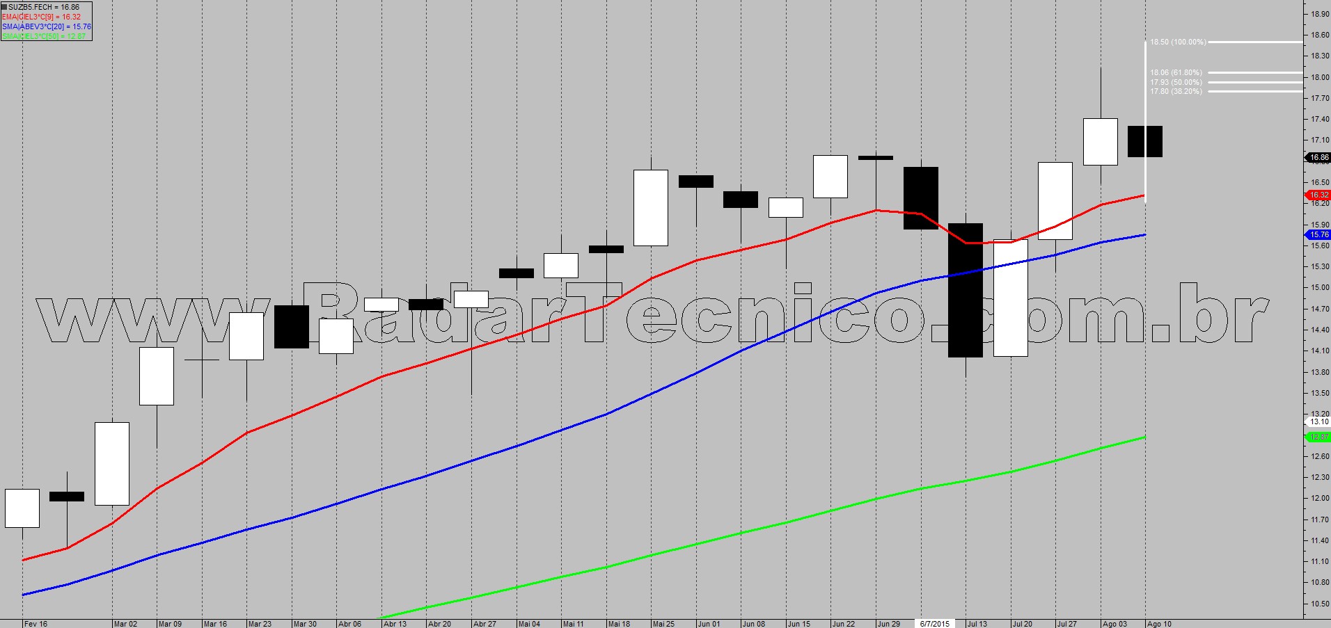O papel SUZB5 encontra-se com médias móveis de 20 e 50 períodos ordenadas e ascendentes, autorizando um possível trade pelo setup de ponto contínuo, na superação de R$ 13,90 com alvo inicial em R$ 14,54 e stop posicionado em R$ 13,23.