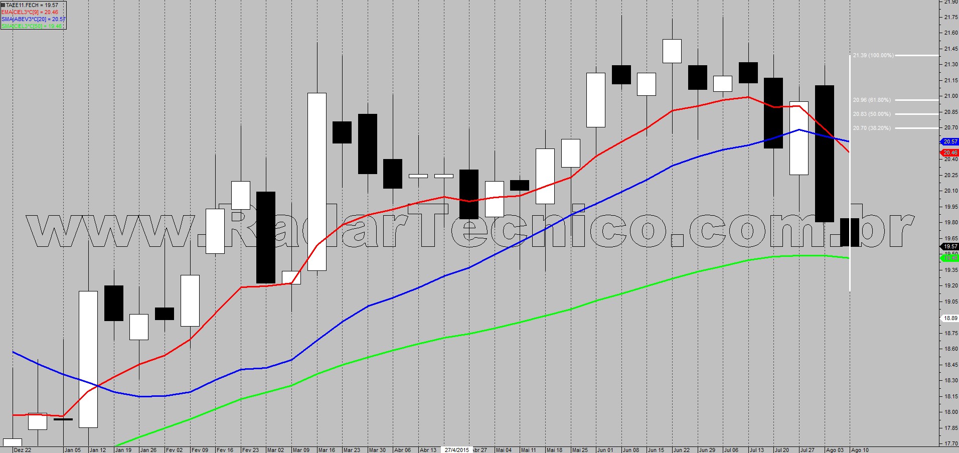 Pelo gráfico semanal, o papel TAEE11 encontra-se numa tendência primária de alta. Após correção nos preços ativo acionará setup de Ponto Contínuo na mm (média móvel) de 50 períodos se atingir o ponto de entrada localizado na superação de R$ 20,27, alvo de R$ 21,39 e stop em R$ 19,14.